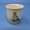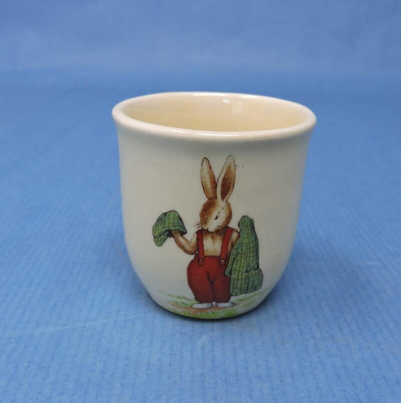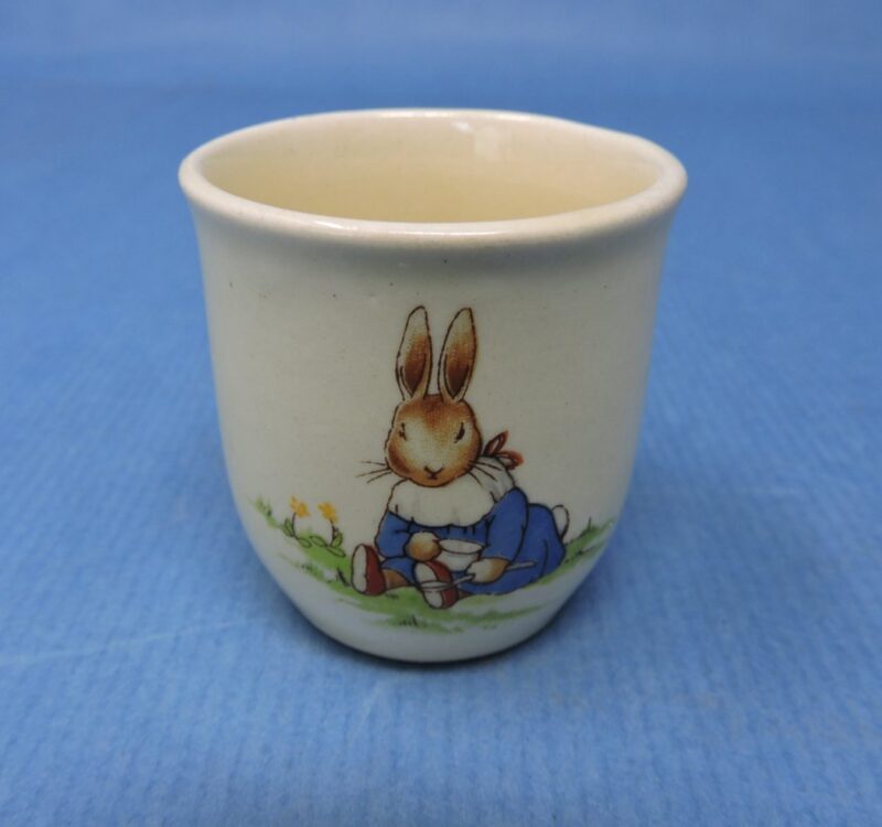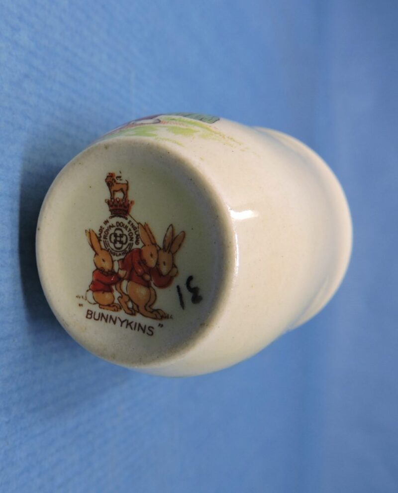 The egg cup shows the Royal Doulton maker’s marks on the underside and reads “Bunnykins”.