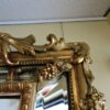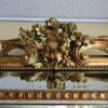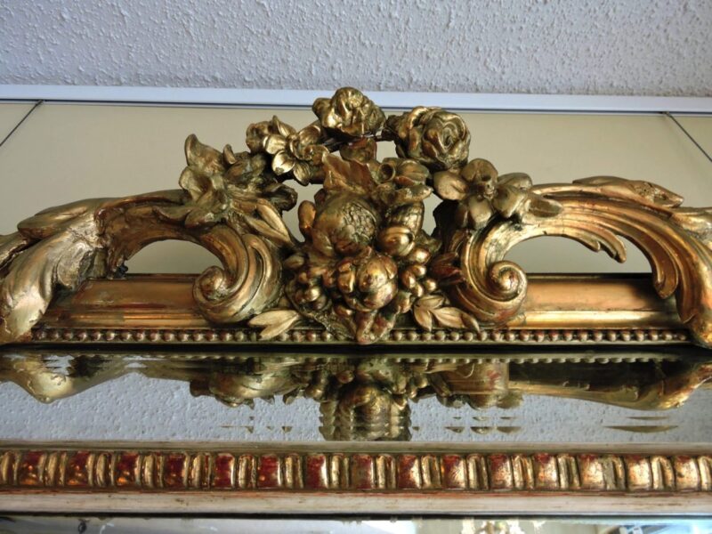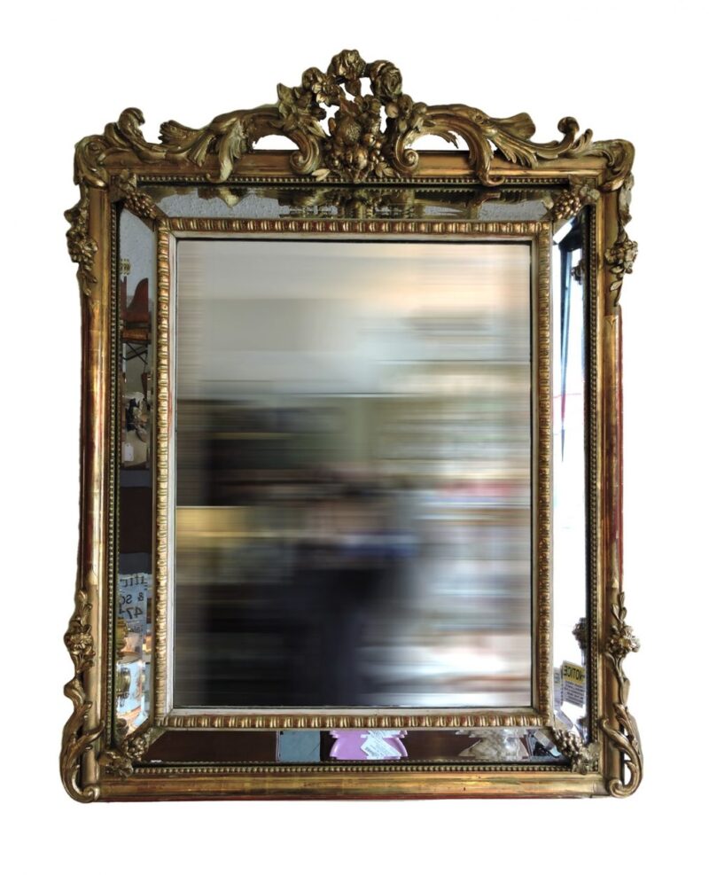 Elaborately  carved floral and fruit decoration with a bevelled glass centre mirror that is raised with lower bevelled glass sections around to create a sense of a pillow or cushion shape.