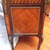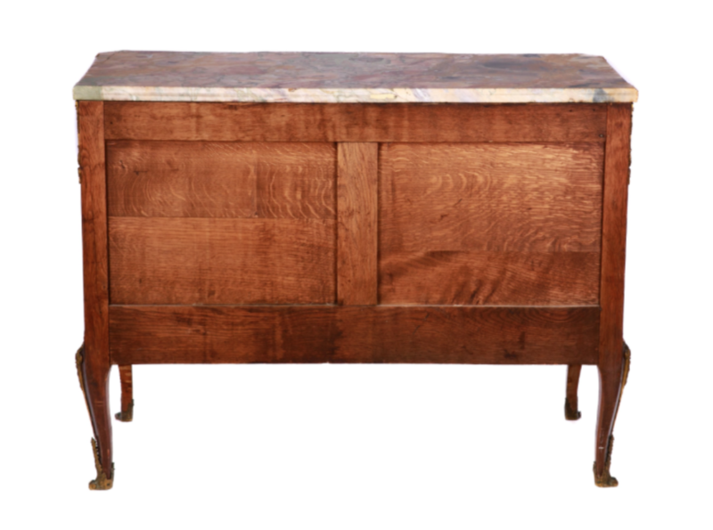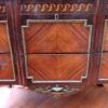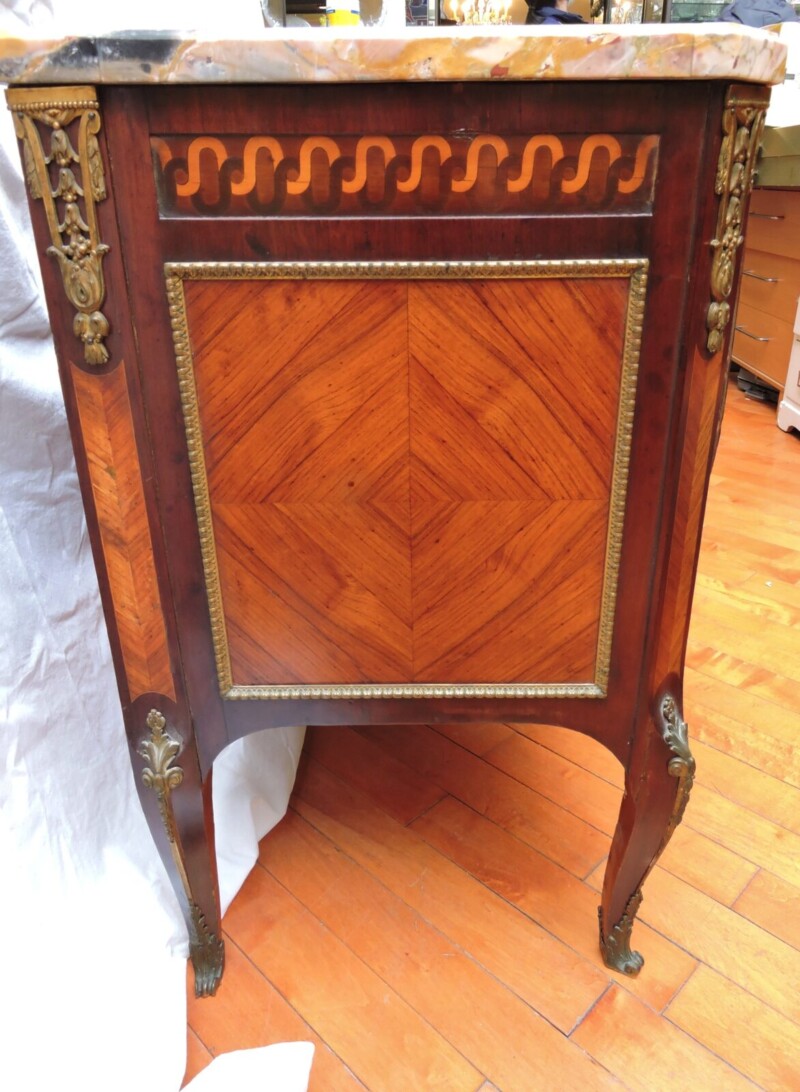 v** SOLD ARCHIVES **vA large single onyx topped French commode in the French Transitional style. Kingwood parquetry inlaid fronts and sides with mahogany trim and ormolu mounts. The commode has two large drawers. The onyx top is translucent with many varied colours.