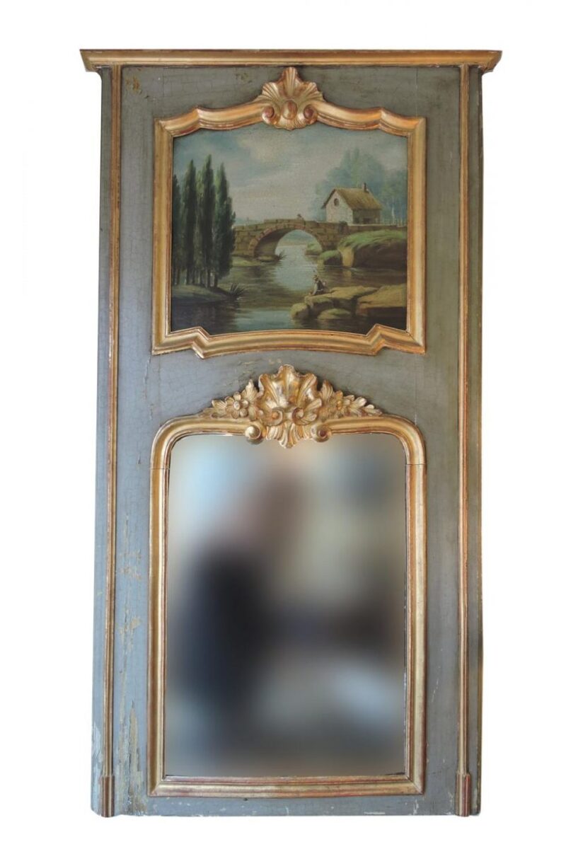 A lovely French 19th century painted and gilt wood Trumeau mirror with an inset oil painting of a French country scene of a house and bridge over water.  Both the painting and the mirror are trimmed in a carved gilt wood decorative framing.  The background colour of the wood is a sage green.