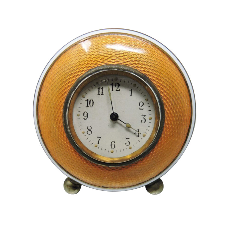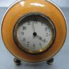 A lovely French small 8-day circular travel clock with an orange guilloche and white enamel on brass case. The clock sits on two ball feet attached to a circular brass backing to allow the clock to sit upright.