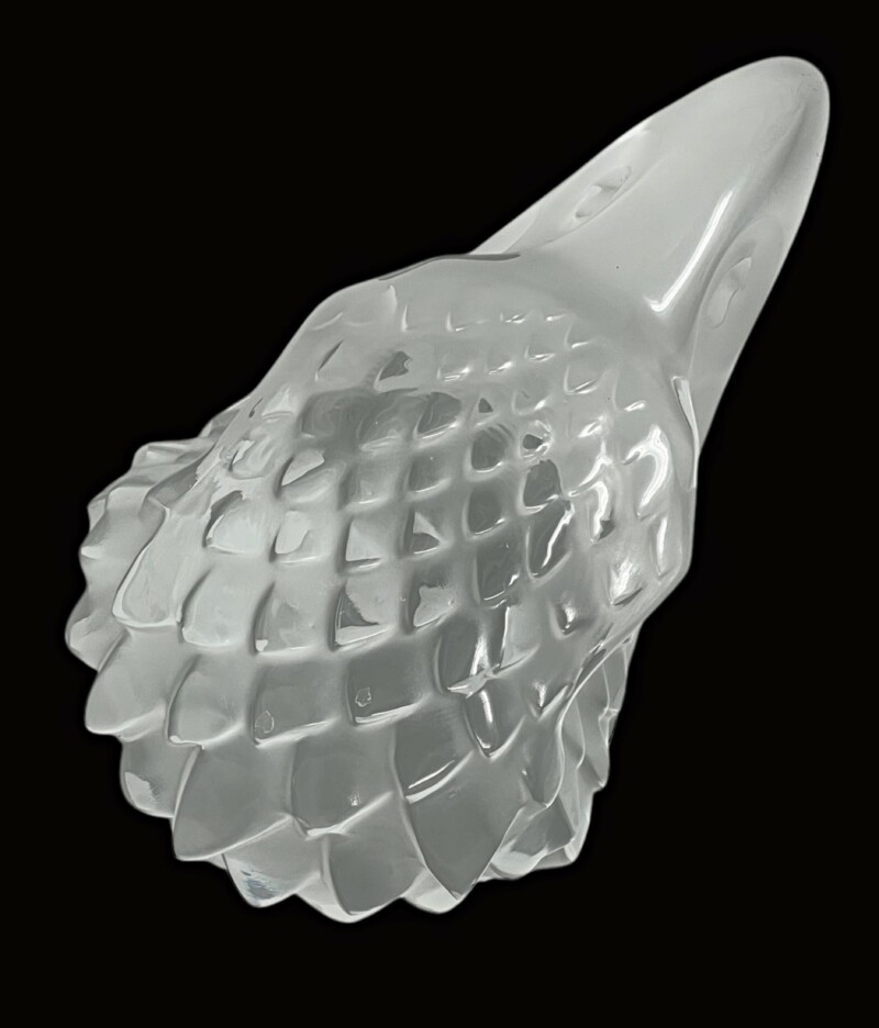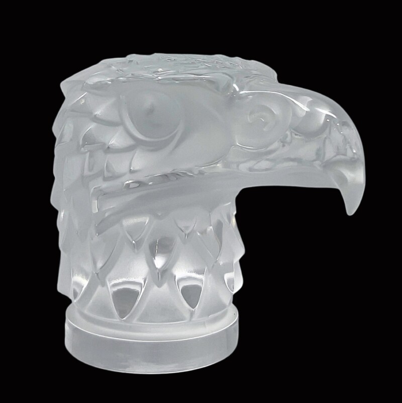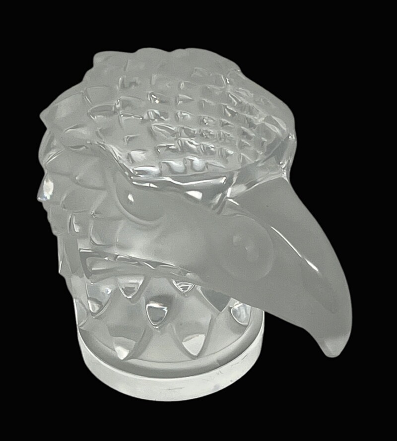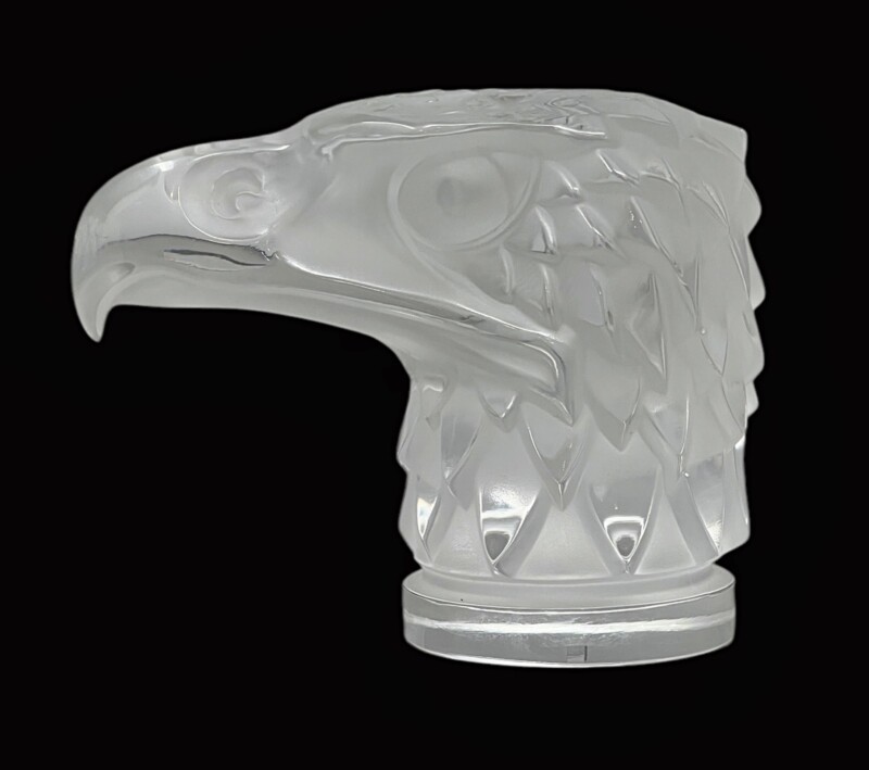 Wonderfully detailed French Art Deco, an imposing glass car mascot entitled ‘Tête D’Aigle’ or “Eagle’s Head” is finely moulded and hand finished frosted and polished glass. Signed “Lalique France” on the base, these “glass art sculptures” were originally designed as car hood ornaments, in the 1920s, by the famous glass maker René Lalique whose company still creates fine glassware today.