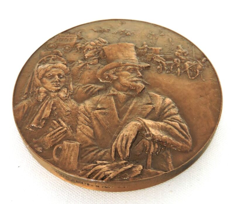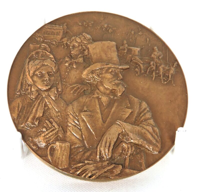 Here is a wonderful French Commemorative bronze medal from the French Mint in Paris, dated June 1967 and stamped “1967 No. 108/800” on the rim.  One side shows a scene with figures in travelling clothes and horses and carriages in the background.