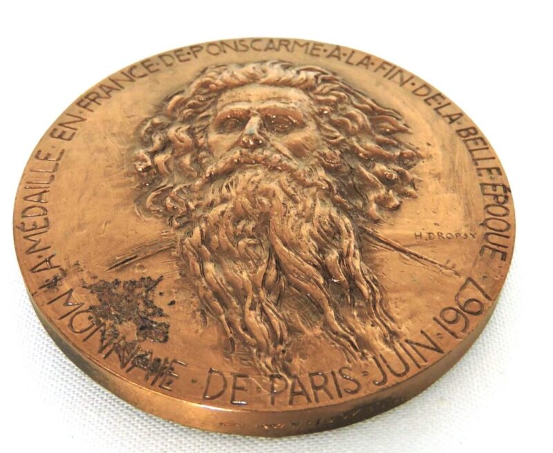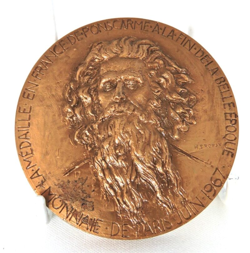 The other side shows the face of a man with wild hair and beard.  The artist’s name “H. Dropsy” is stamped to the right of the man’s shoulder.  Around the outside of the medallion is stamped “La Medaille En Frame Deponscarme. A La Fin De La Belle Epoque. Monnaie de Paris Juin 1967”.