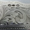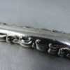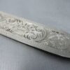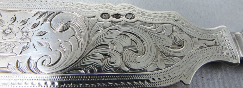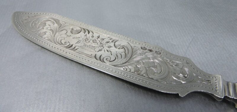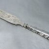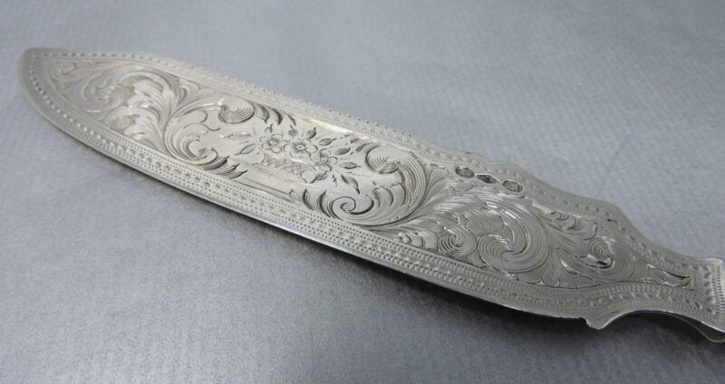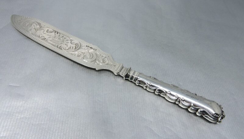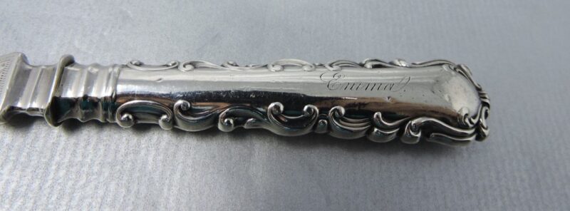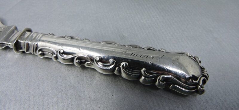 A lovely French silver cake knife with beautifully embossed floral and swirl decorations and a serrated edge on the blade. The handle of the knife is engraved “Emma”.
