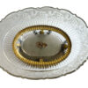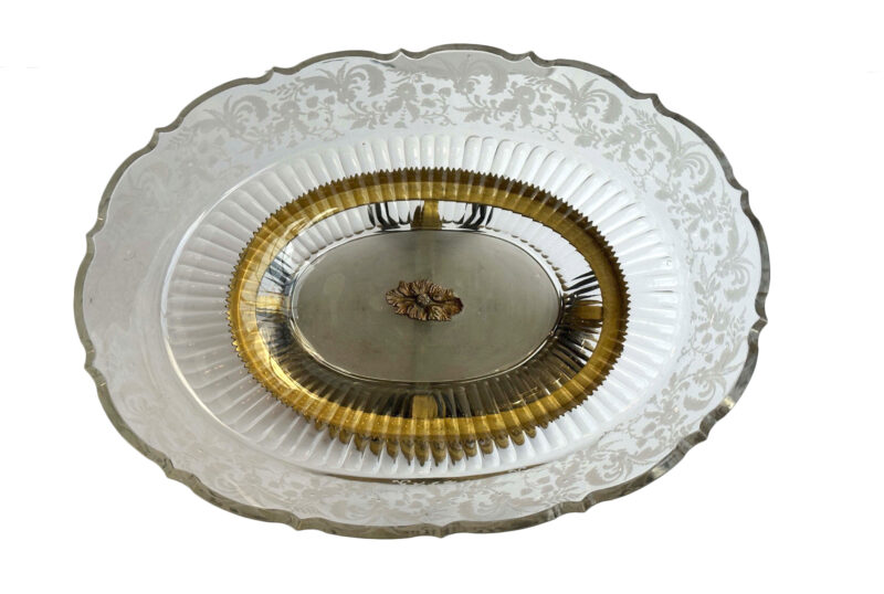 A fantastic French Empire style gilt bronze and etched crystal centerpiece.  There are 4 Nubian figural women holding up the etched crystal centerpiece.    The oval base is supported by 4 lion paw shaped feet.