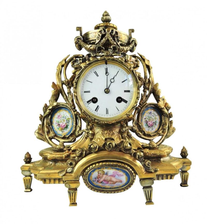 v** SOLD ARCHIVES **vA fine gilt bronze clock with white porcelain face and 12-hour roman numeral clock, with three hand-painted porcelain plaques inset into the body. The clock is a nice smaller size that is rather unique and well-balanced. Clock is in fine working order, and the chime strikes on the hour and the half hour. Pendulum and key included. The maker is Japy Freres, a well known French clock maker in Paris.