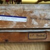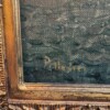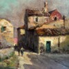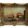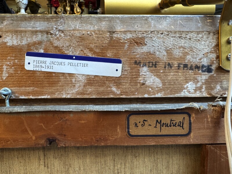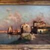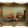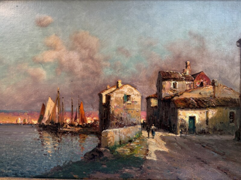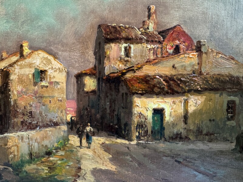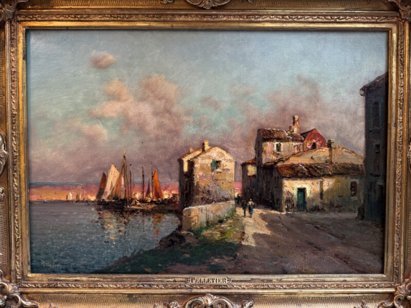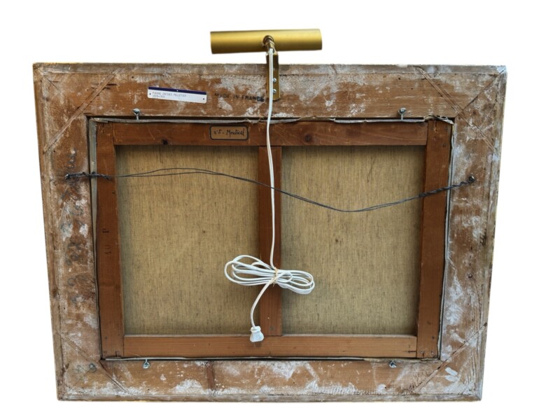 The subject is a village scene with gorgeous contrasting views of the ” quaint village buildings” against “boats on the water in port and the open sunny sky”.  A couple walks on a path leading to the port.  The original gilt wood frame suits the time period of the work and has a frame “mounted picture light”. Signed by the artist on the front lower left and artist name plate on the frame center front. “Made in France” stamped on the back along with a tag “n.5 Montreal”
