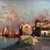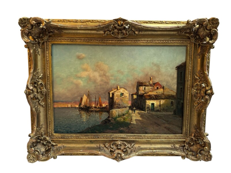 French Impressionistic Oil Painting By Pierre Jacques Pelletier (1869-1931), ” French Village Port Scene” Signed by the Artist