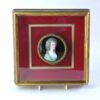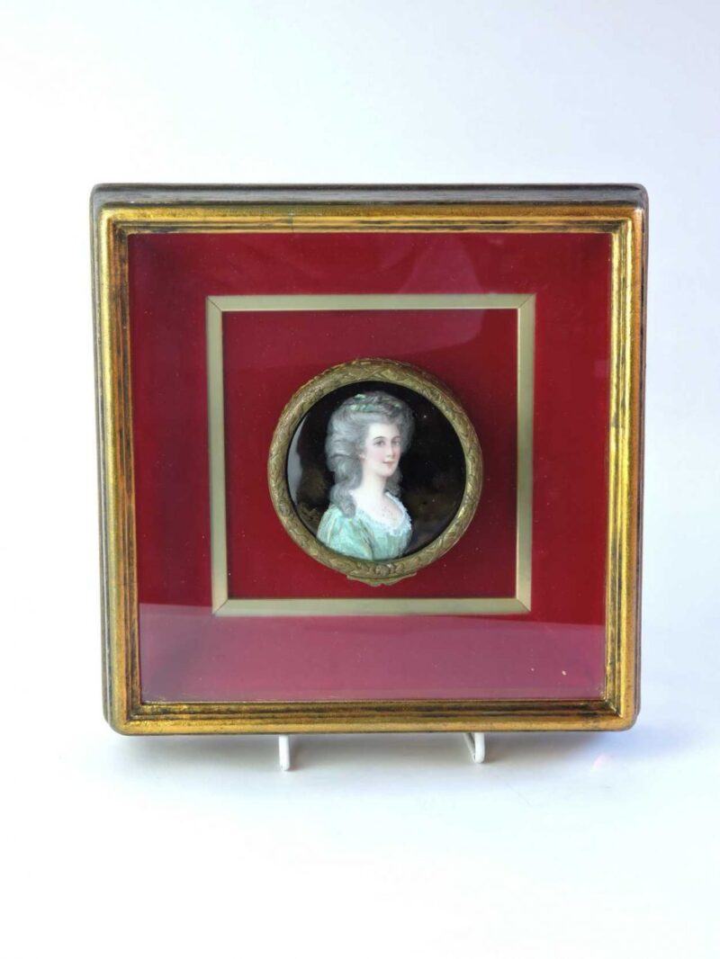 A French round jewelry box that has a Limoges enamelled portrait of a lady on it’s lid.  The box has been encased in a Shadowbox frame for display to hang on the wall.  The portrait is very well done and is the centrepiece of this box.  The Limoges enamelling would be enamelled over copper.
