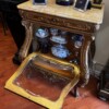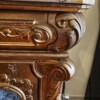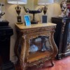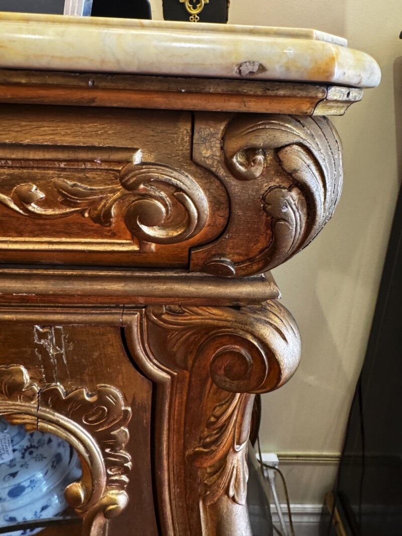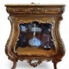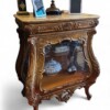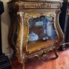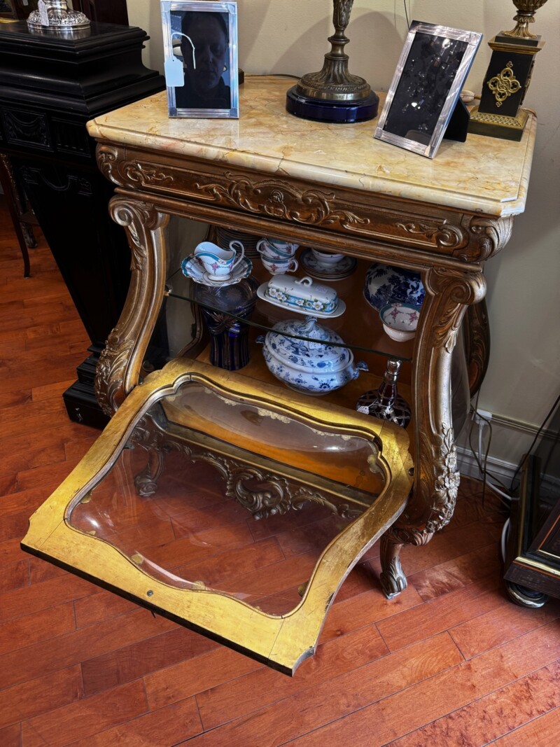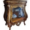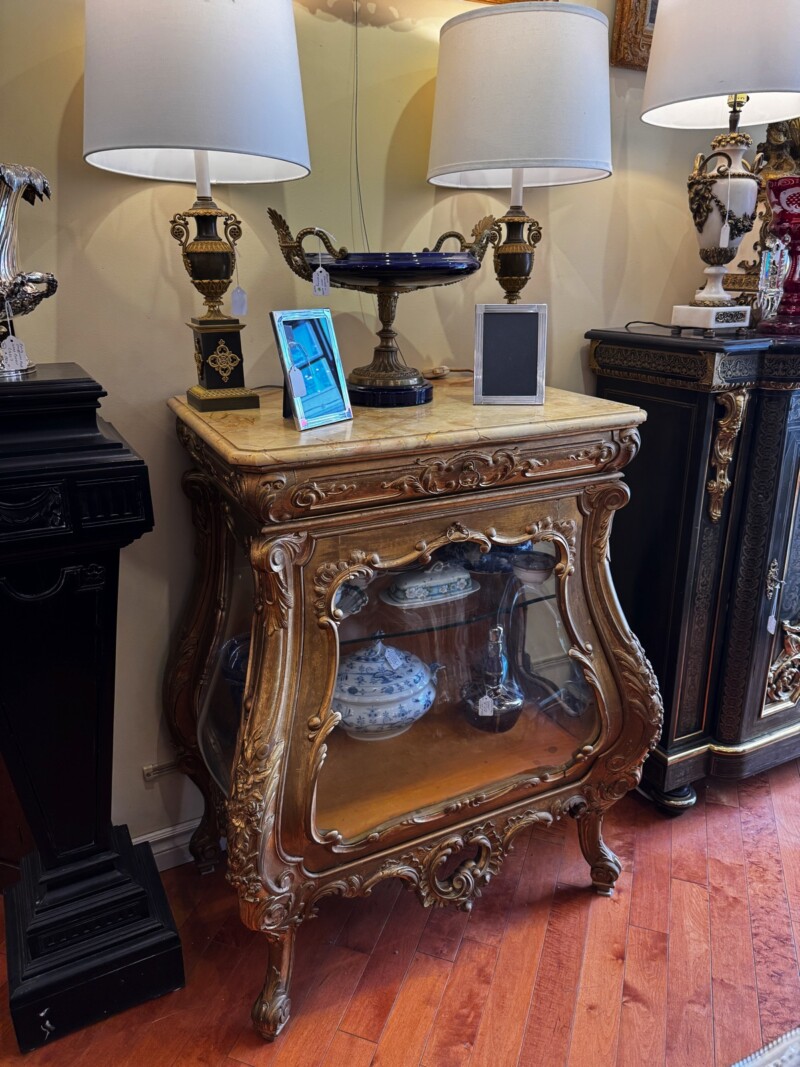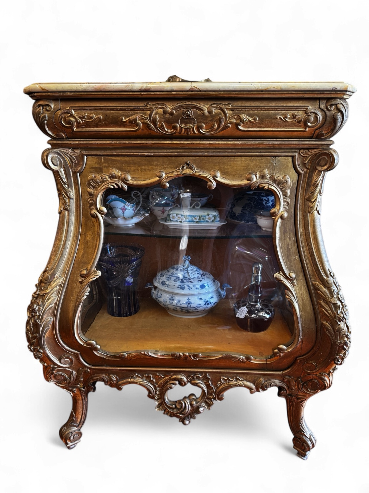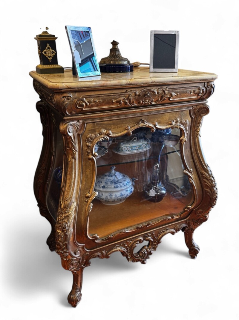FurnitureAn exquisite Louis XV-style curio cabinet, featuring elegantly curved glass panels on the sides and a front door that pulls down for easy access. Crafted with intricate carved floral details, the cabinet showcases a classic bombe (Bombay) silhouette and stands on gracefully shaped Louis XV legs. Topped with a striking marble slab, this piece is both functional and decorative—an ideal statement for any room in the home. There is also a single hidden drawer located just under the marble top.