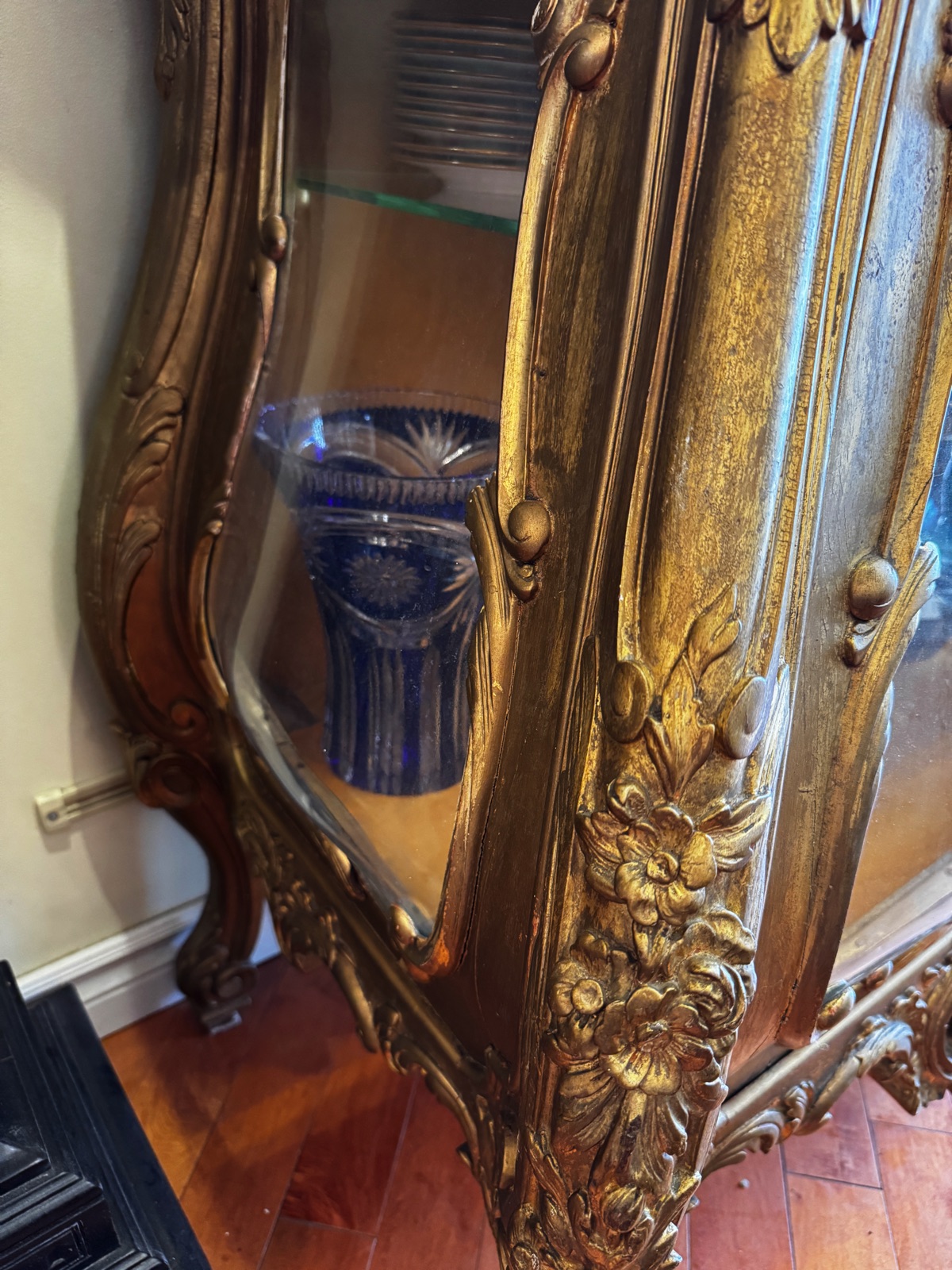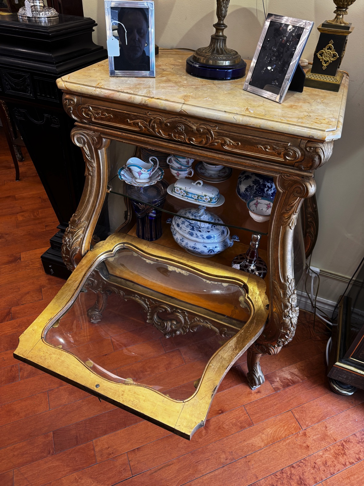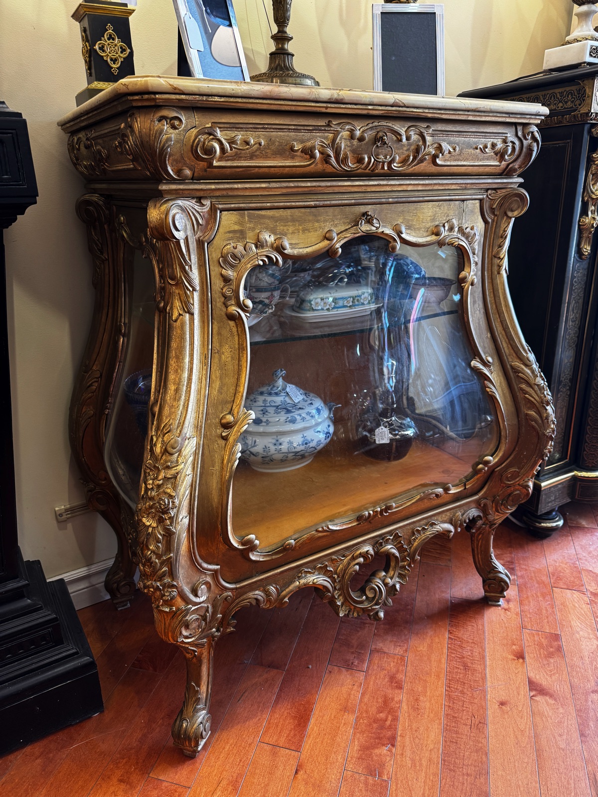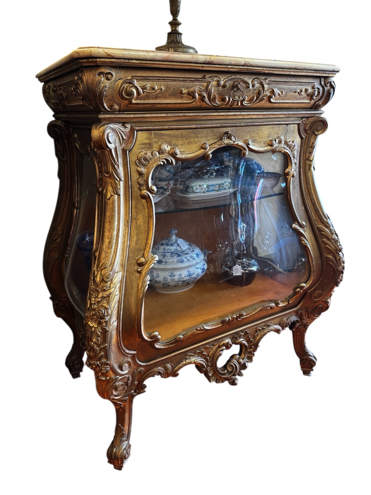French Louis XV Style Gilt Wood Curio Cabinet with Curved Glass and Marble Top – circa 1900