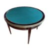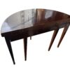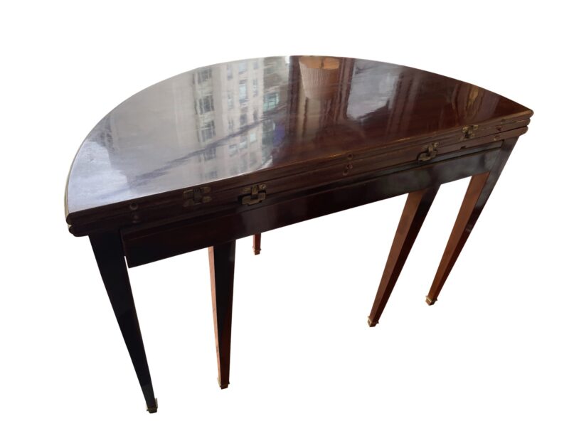 v** SOLD ARCHIVES **vA late 19th century / early 20th century French Mahogany Demi-lune Table that has two options when open. The table can open the top layer to reveal a green felt games table that when the back legs are pulled out , rests on and becomes a large round games table. The second option is to open the second layer which reveals a mahogany top and then becomes a large round dining table (not pictured). The table can extend from there to add leaves and make a long dining table with the deli-lune ends.