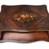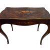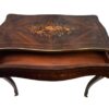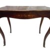 A lovely French mahogany occasional table with satinwood inlay of florals in the top centre of the table – also having bronze trim and curved cabriole legs.  There is one wide pull out drawer.