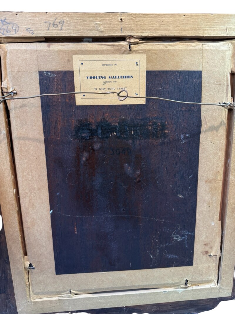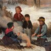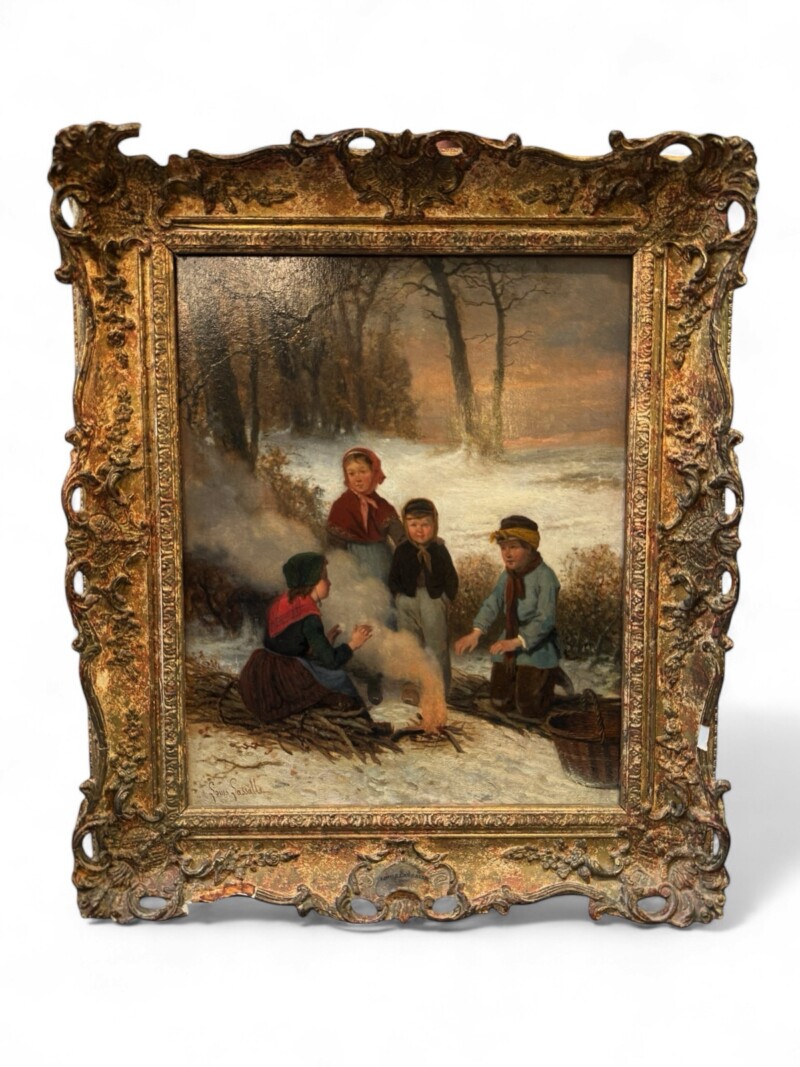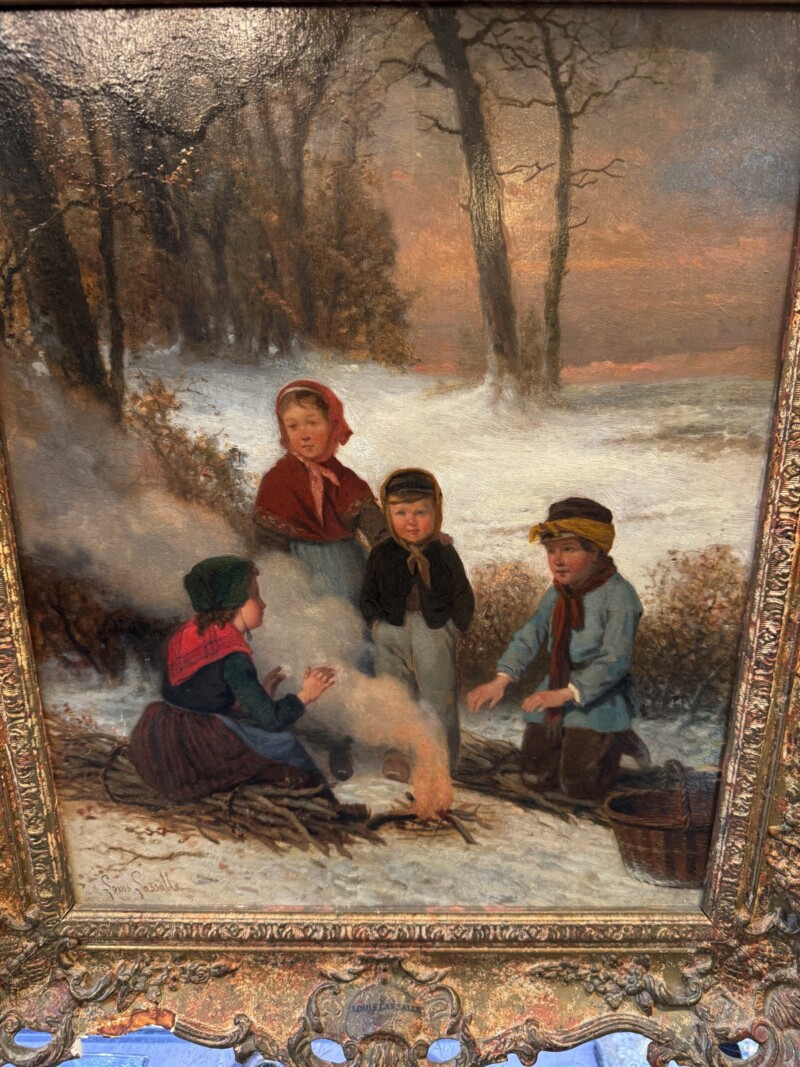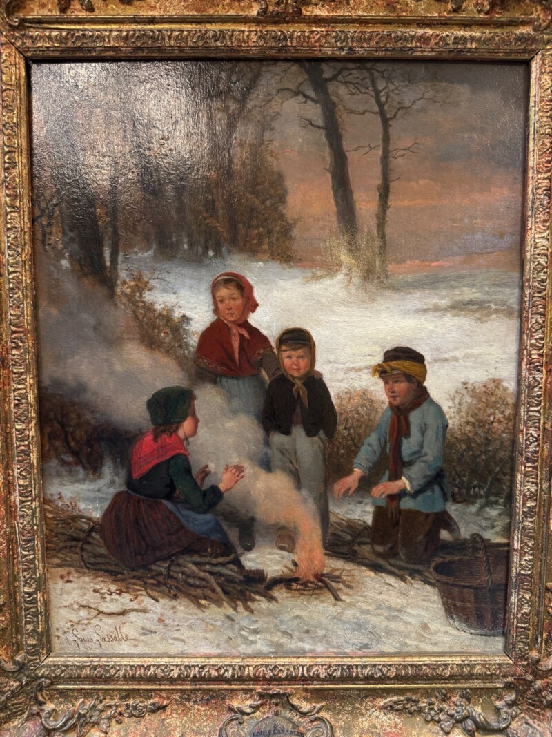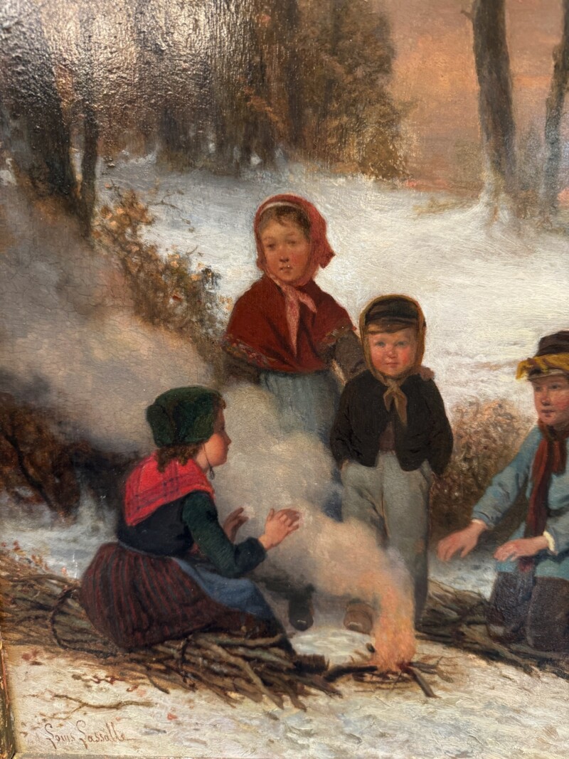 Under the influence of Pierre Edouard Frere, Lassalle turned to genre painting with a particular talent for scenes depicting young children, liking to especially to paint “snow effects”. We see his wonderful talent in the painting presented here, where you can feel the cold and wind around the children warming themselves at a “stick fire”. The painting is signed by the artist on the bottom left and his name is inscribed on the original frame, center front. The provenance is marked on the back of the panel “COOLING GALLERIES” LONDON.