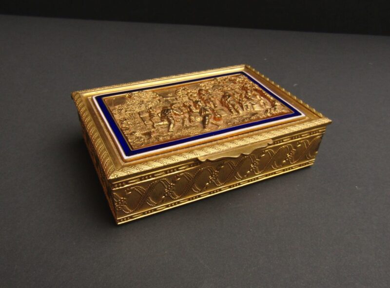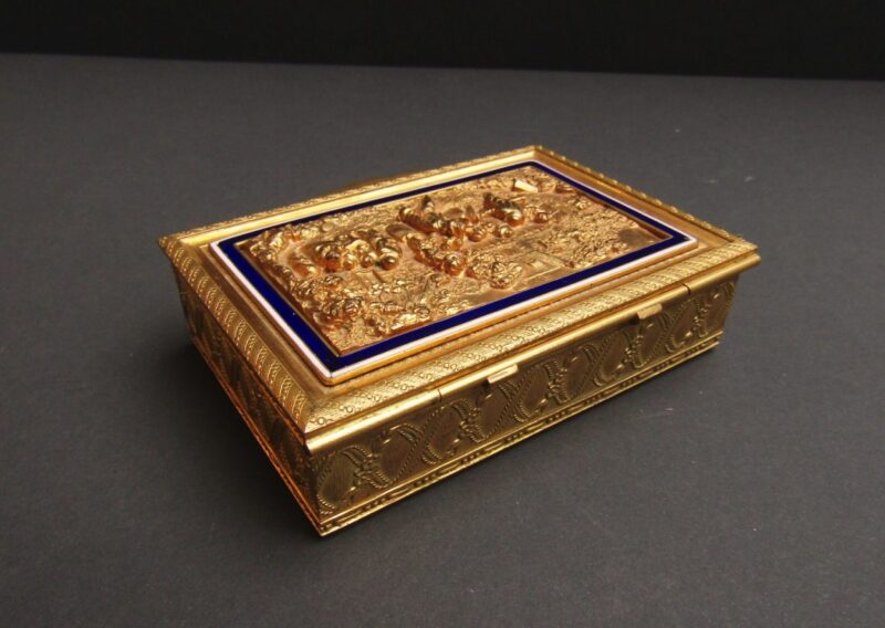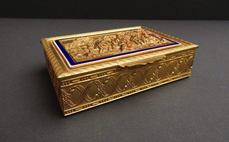 French Ormolu & Enamel Wood-lined Box With a Hinged Lid, Detailed Exterior Scene with Figures – circa 1900