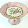 A lovely French porcelain pedestal comport with a white background and underside, hand-painted in pink with painted and enamelled floral decoration and gilt accents. The underside of the comport reads “Hand Painted Porcelaines Made in France”. The comport is 5 1/2 inches tall X 8 inches in diameter and is in excellent condition.