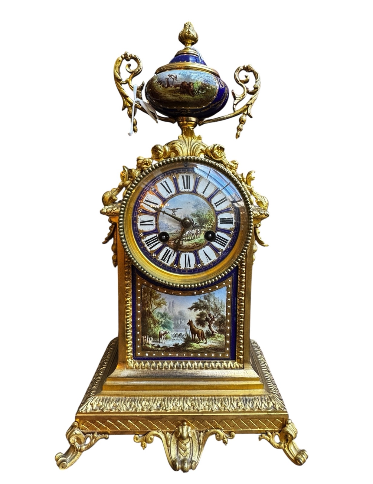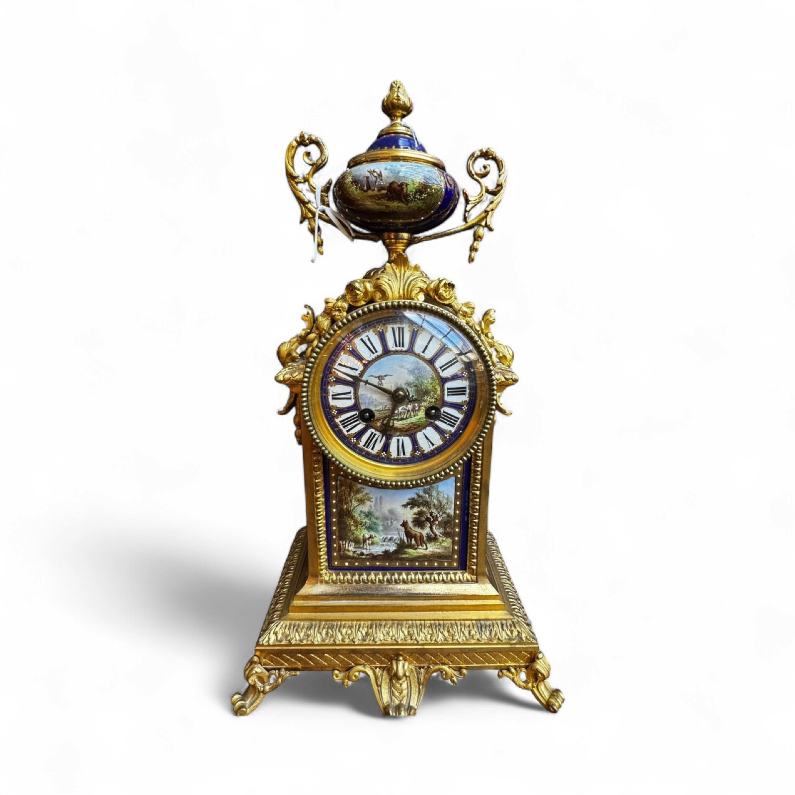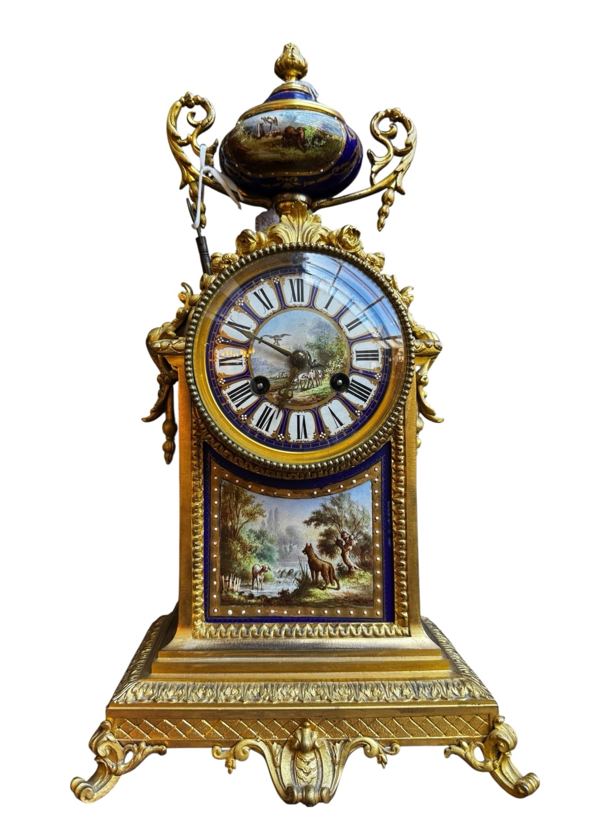 GeneralA French Sèvres-style mantel clock, from the 19th century, features a dark, rich blue or “blue de roi” porcelain, decorated with intricate gilt bronze mounts, and hand-painted porcelain scenes, in a Louis style, particularly the Louis XVI period. The overall form includes a rich cobalt blue vase-shaped surmount, scrolled handles, a circular 8 day cycle clock and porcelain dial with Roman numerals and a small painted scene. The elaborate ormolu case with fluted block feet has a hand painted porcelain scene depicting a river/forest setting and animal motifs.