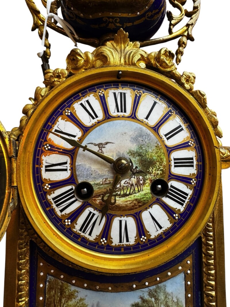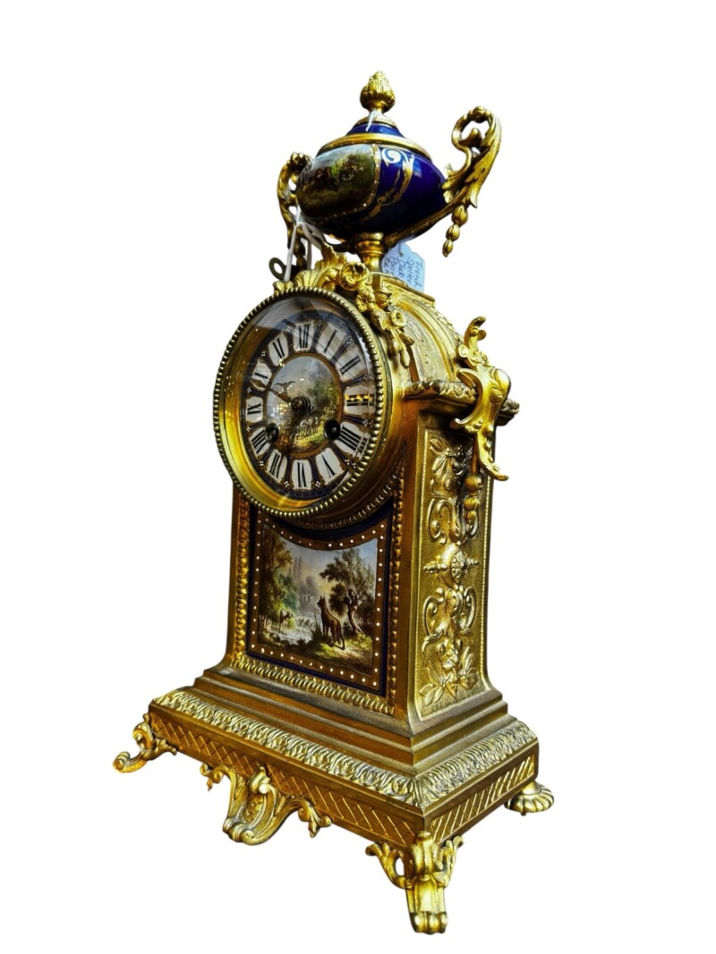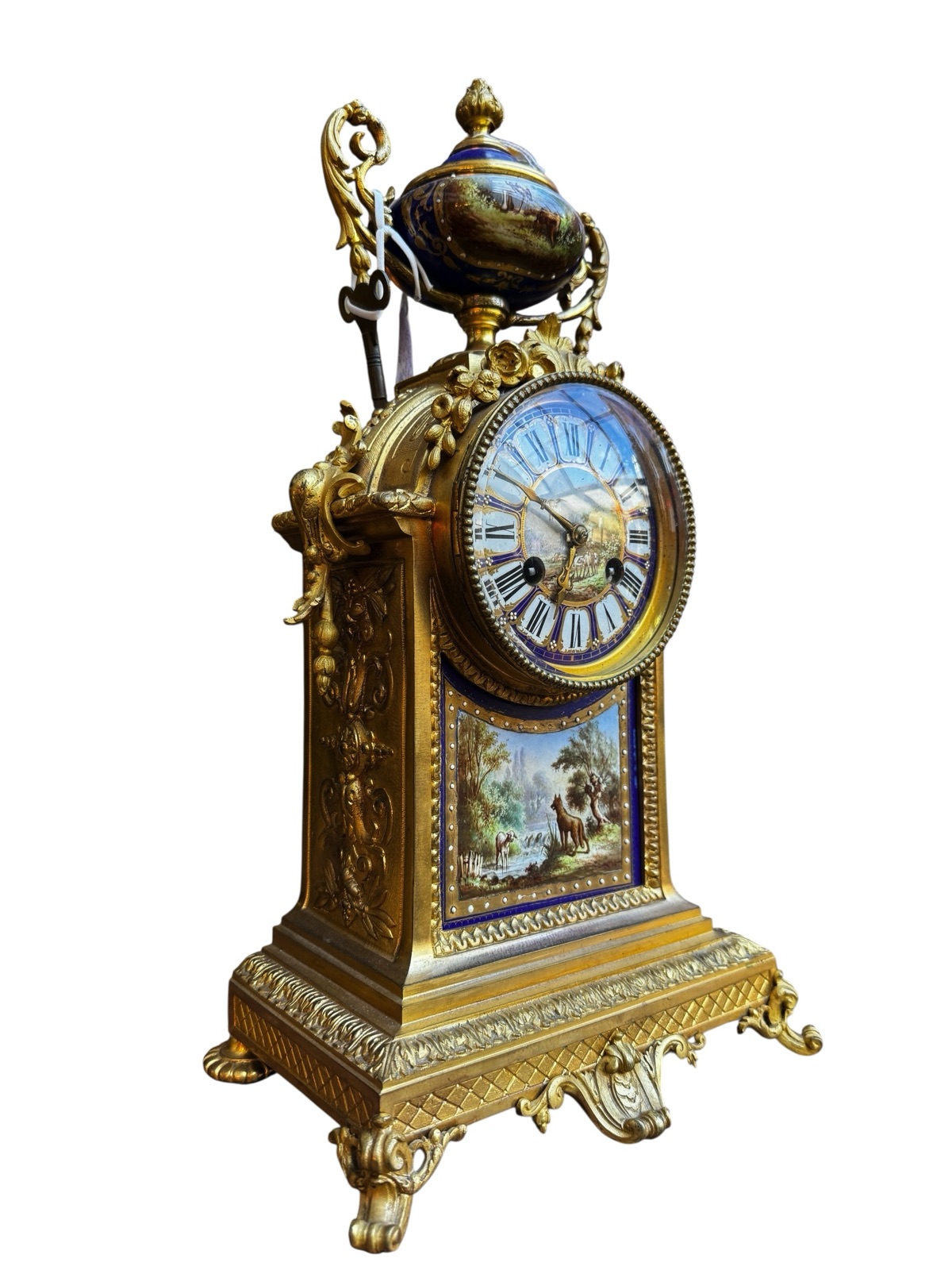 GeneralA French Sèvres-style mantel clock, from the 19th century, features a dark, rich blue or “blue de roi” porcelain, decorated with intricate gilt bronze mounts, and hand-painted porcelain scenes, in a Louis style, particularly the Louis XVI period. The overall form includes a rich cobalt blue vase-shaped surmount, scrolled handles, a circular 8 day cycle clock and porcelain dial with Roman numerals and a small painted scene. The elaborate ormolu case with fluted block feet has a hand painted porcelain scene depicting a river/forest setting and animal motifs.