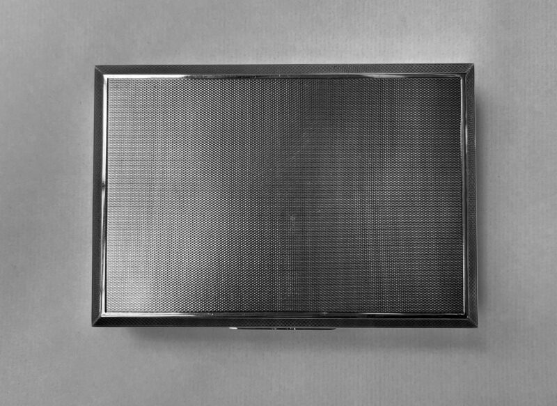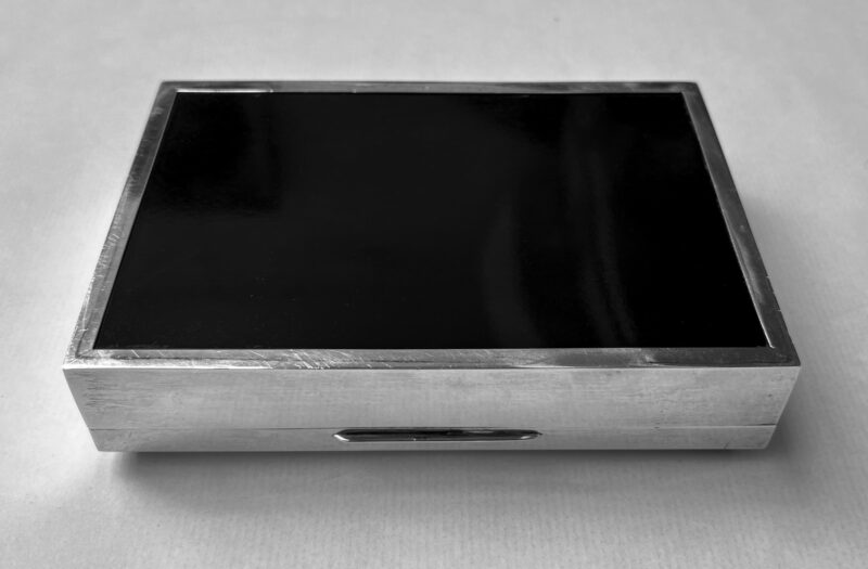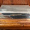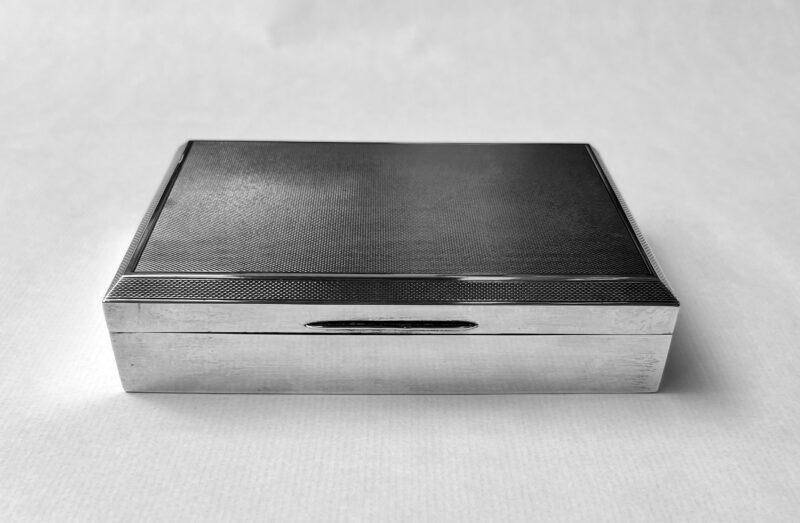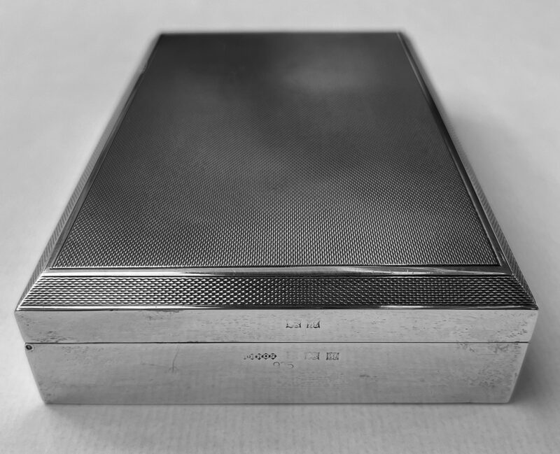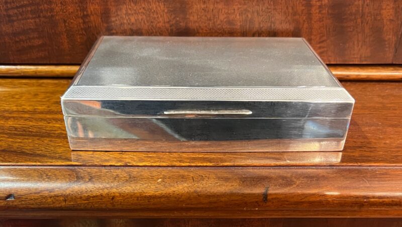 A fine, large gentlemen’s sterling silver box made in Birmingham and hallmarked 1961. The box has a “masculine” appeal in its original intention as a cigar box. Today, the functionality is much broader to include many uses because the cedar interior is complete with the original moveable divider. In excellent condition and a fine, personal “dresser top” addition.