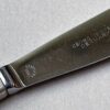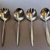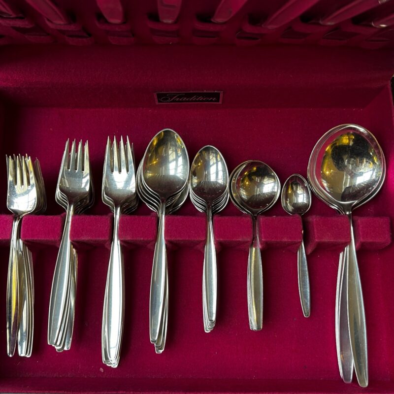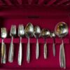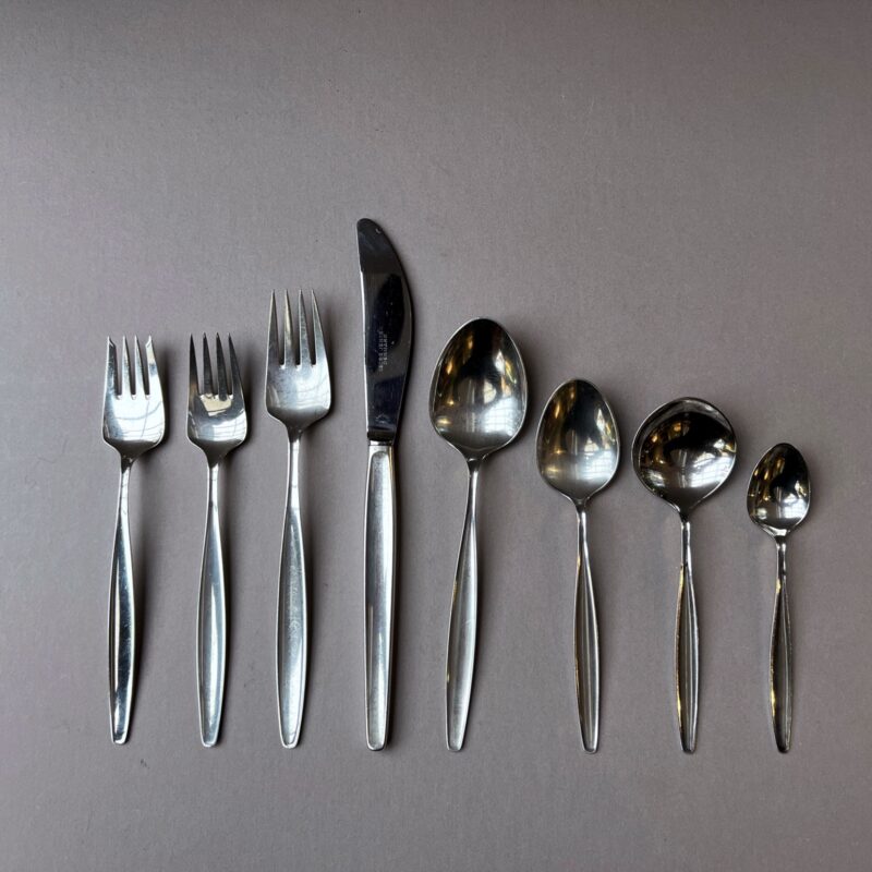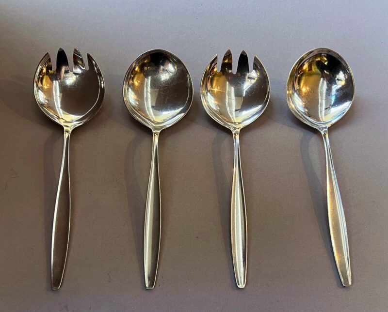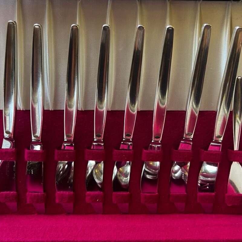 8 dinner knives (8.75″), 7 dinner forks ( 7.5″), 8 dessert/oval soup spoons ( 7″), 8 salad forks ( 6.75″), 8 pastry/dessert forks (6.75″), 7 teaspoons (6″), 6 cream/soup spoons (5.75″), 2 demitasse spoons ( 5″), 2 pairs of large server spoons/salad servers (8.5″), 1 butter knife (6.25″) and 1 fruit knife(6.75″).
