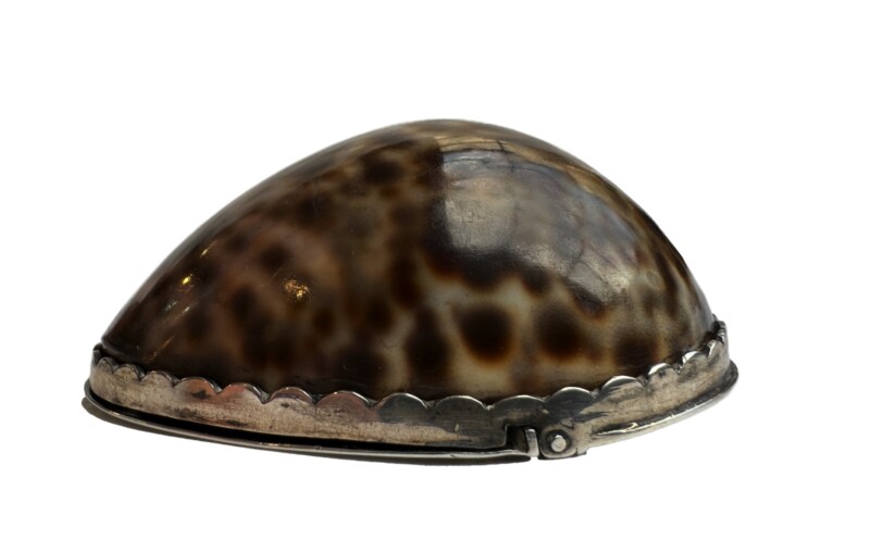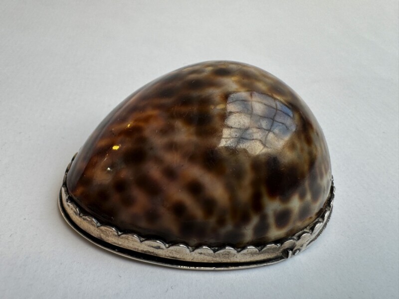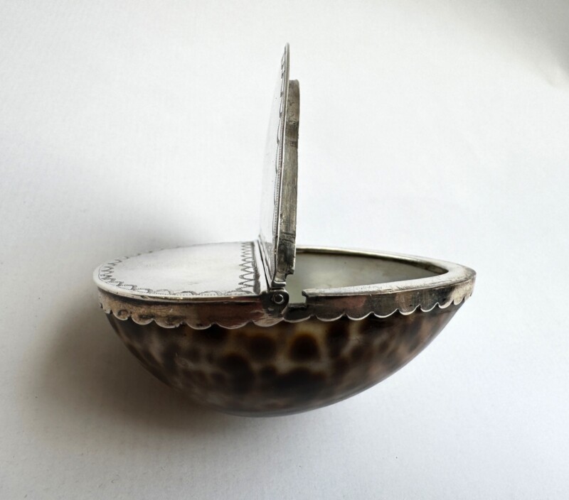 Georgian Cowrie Shell Snuff Box with Mounted Engraved Hinged Silver Cover