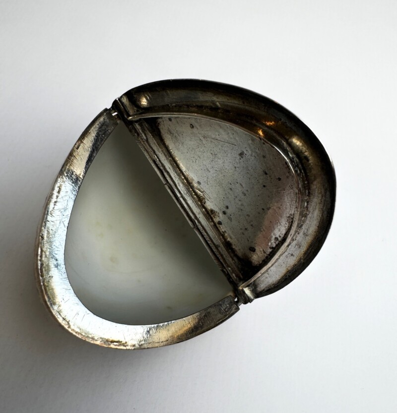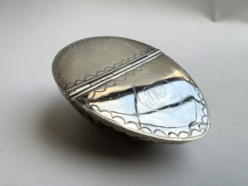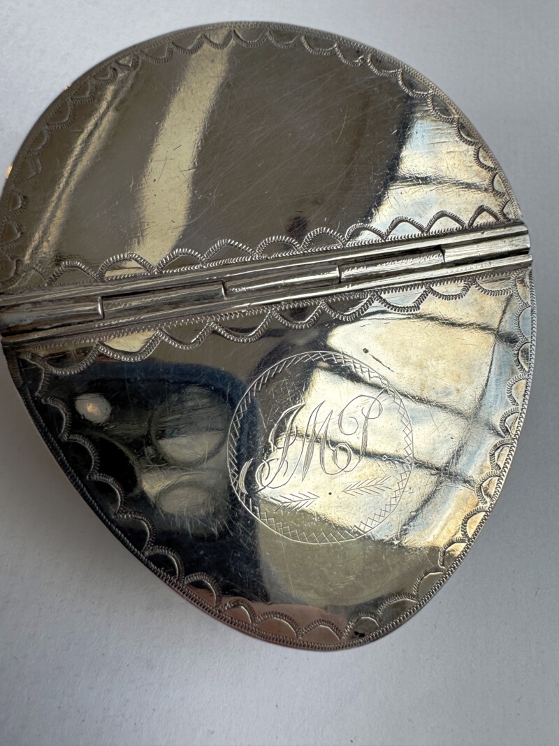 A handsome Georgian silver mounted cowrie shell snuff box with hinged cover.  Cover has some engraving and initials ‘JMP’.  Silver is unmarked, which is common with these boxes.  Very good condition.  Dates circa 1790-1810.