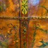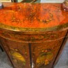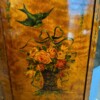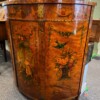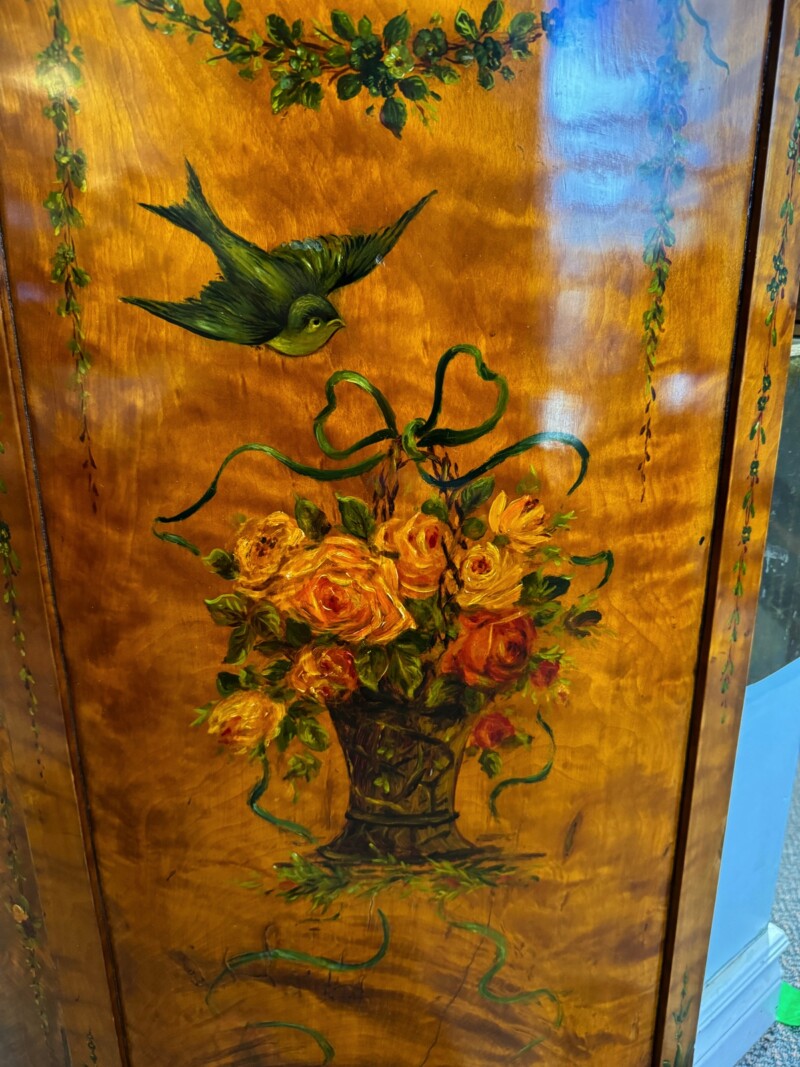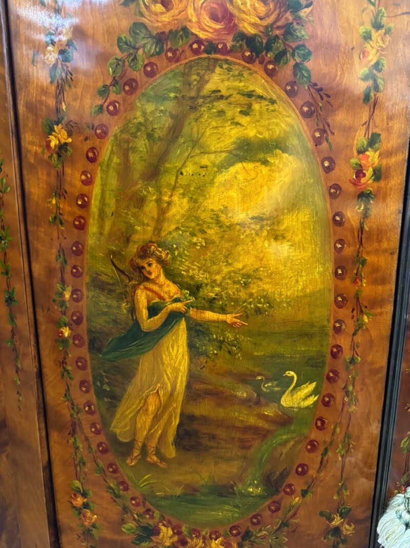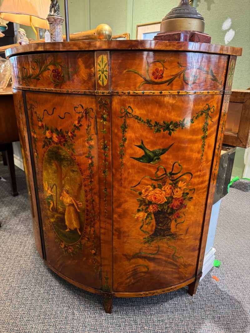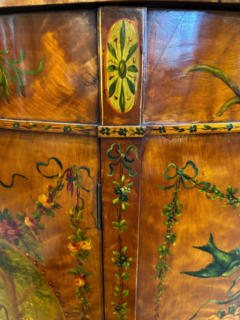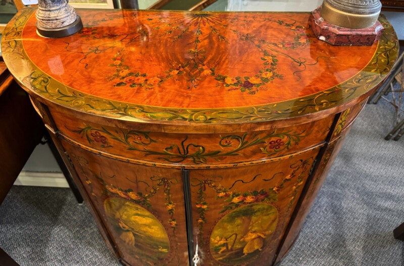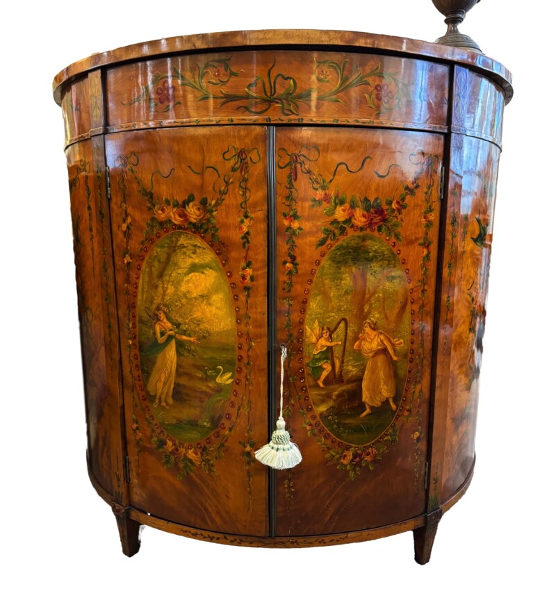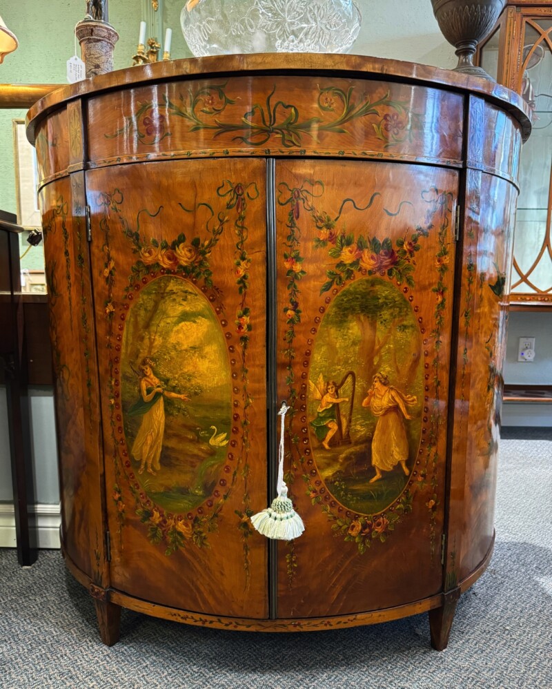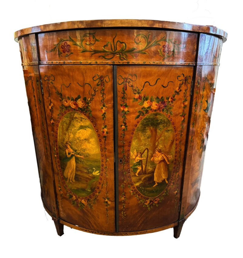 A stunning English Georgian period Demi-lune cabinet.  Crafted from Satinwood, it features exquisite hand-painted Romanticism scenes depicting roses, birds, foliage, and oval vignettes on each door.