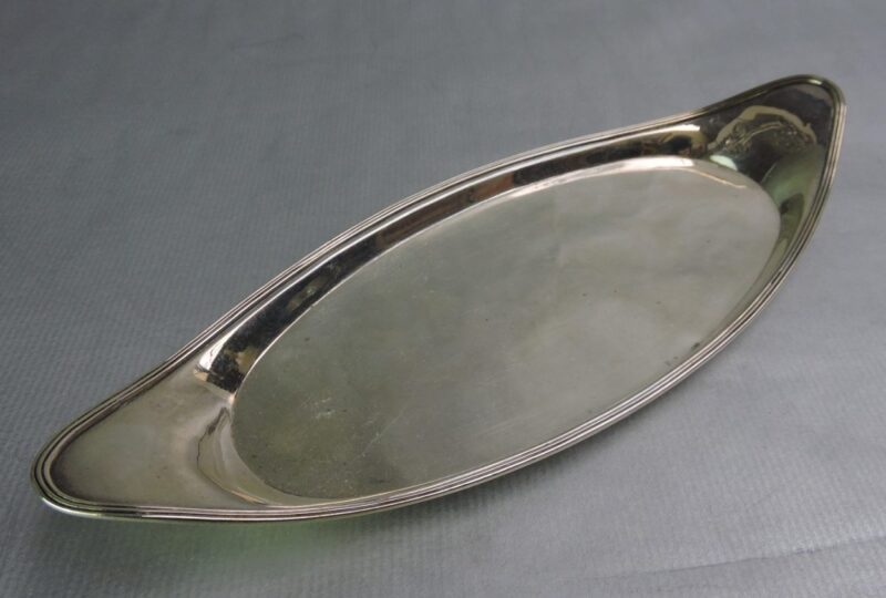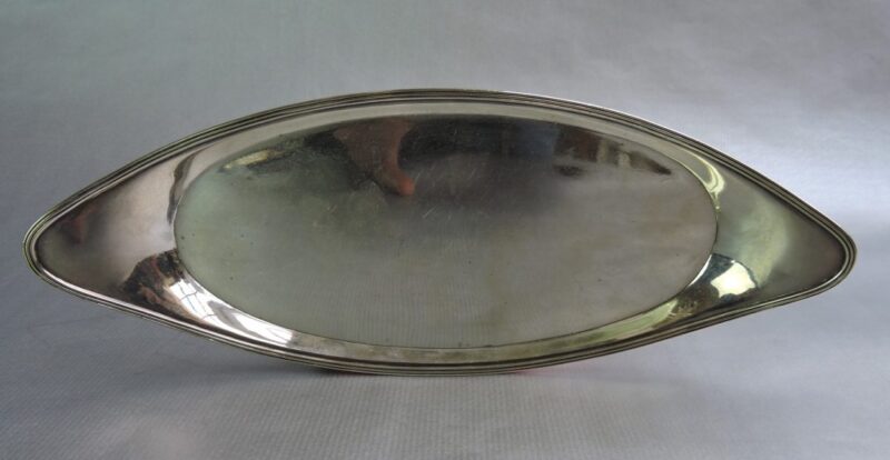 A sterling tray with English Hallmarks, dated 1802 during the time of King George III, London. The tray is small, but bold in style with an elegant leaf shape that pinches on either end. The design of the shape is for a candle snuffer, unique with a strong presence of classic english silver.