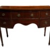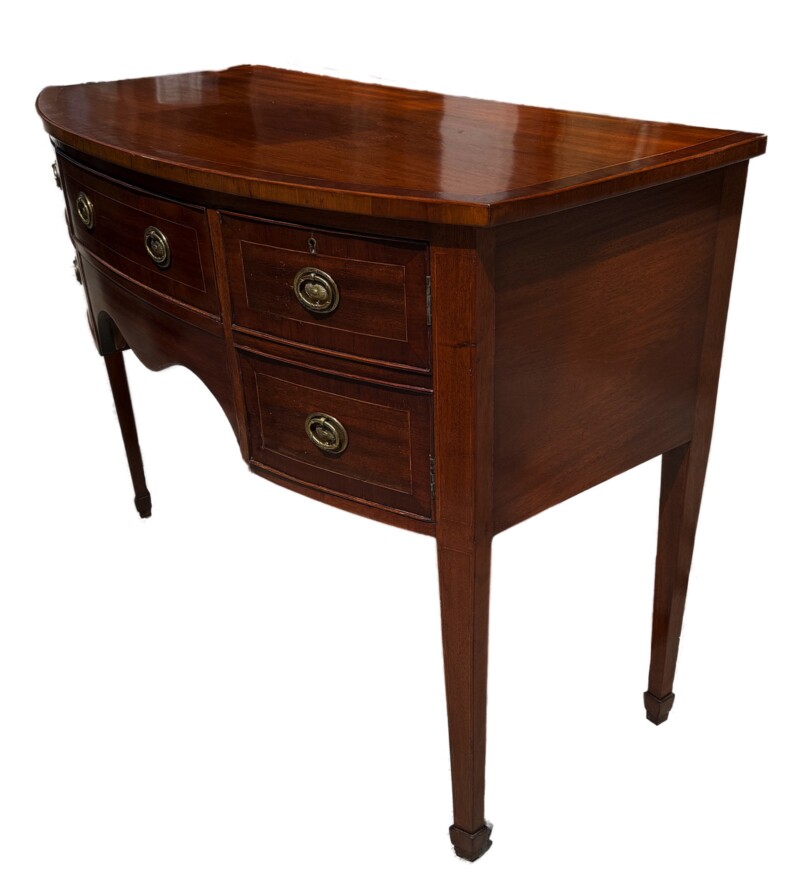 FurnitureA handsome Georgian period circa 1800 bow front sideboard in mahogany with satinwood inlay. A generous well figured curved top over a center drawer and 2 faux drawers on each side, all with brass handles. The 4 faux drawers open 2 on the left and 2 on the right to deeper & generous storage areas. Unusually elegant, mahogany and detailed satinwood inlay decoration throughout lead to long tapering legs with spade foot. Sideboards are one of the most functional and practical pieces of furniture, as fit for their original purpose today as they were in the century that they were made.