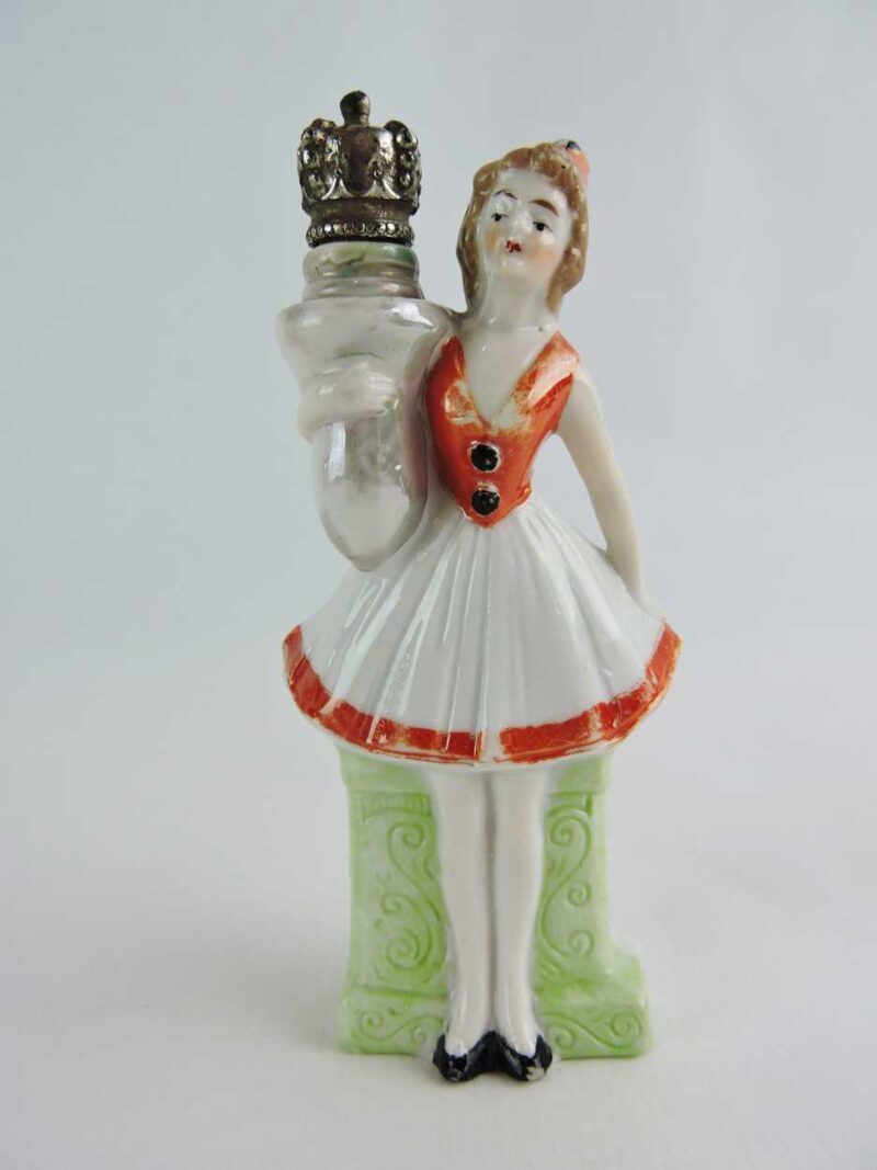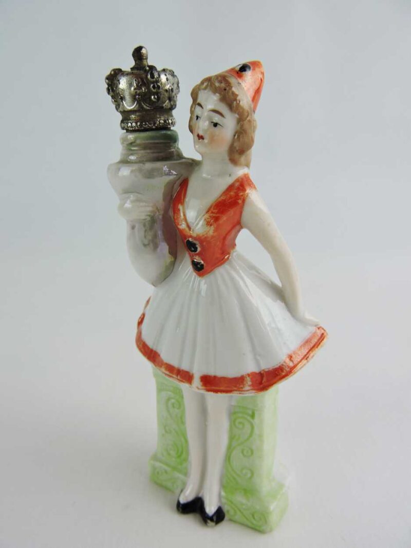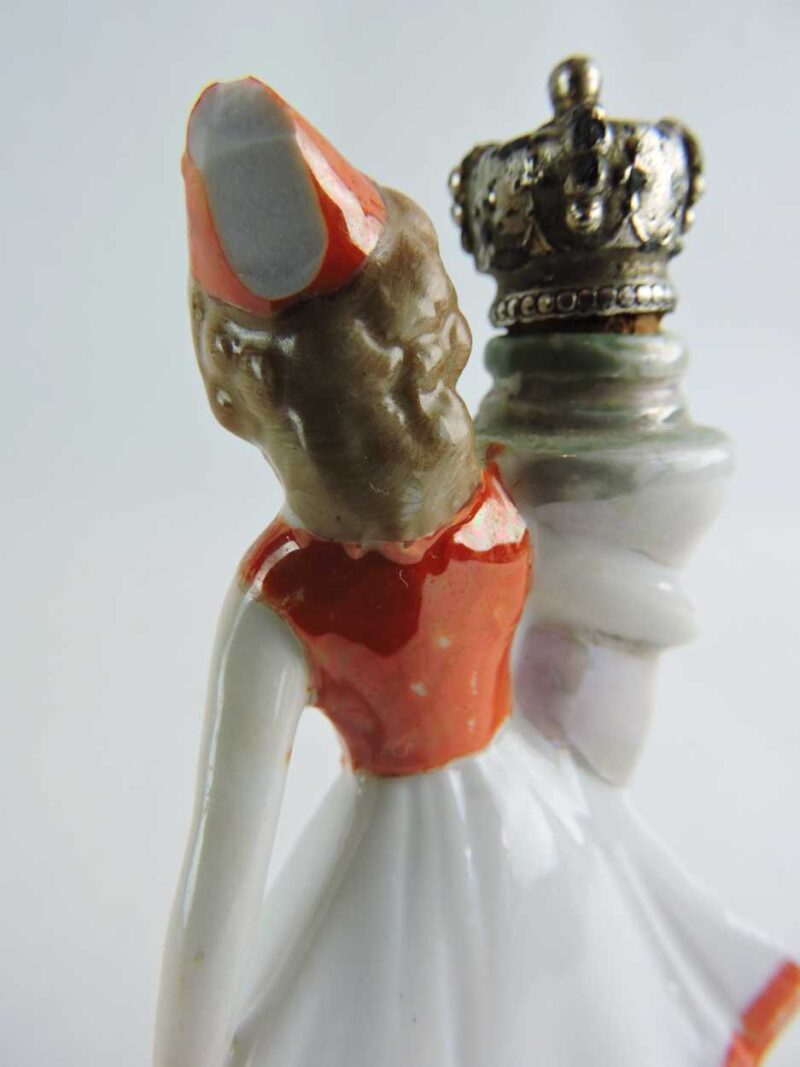 German Figural Porcelain Perfume Bottle – Circus Performer in Orange and Black With Crown