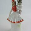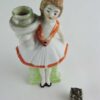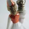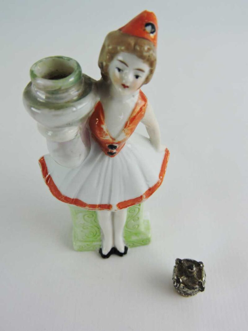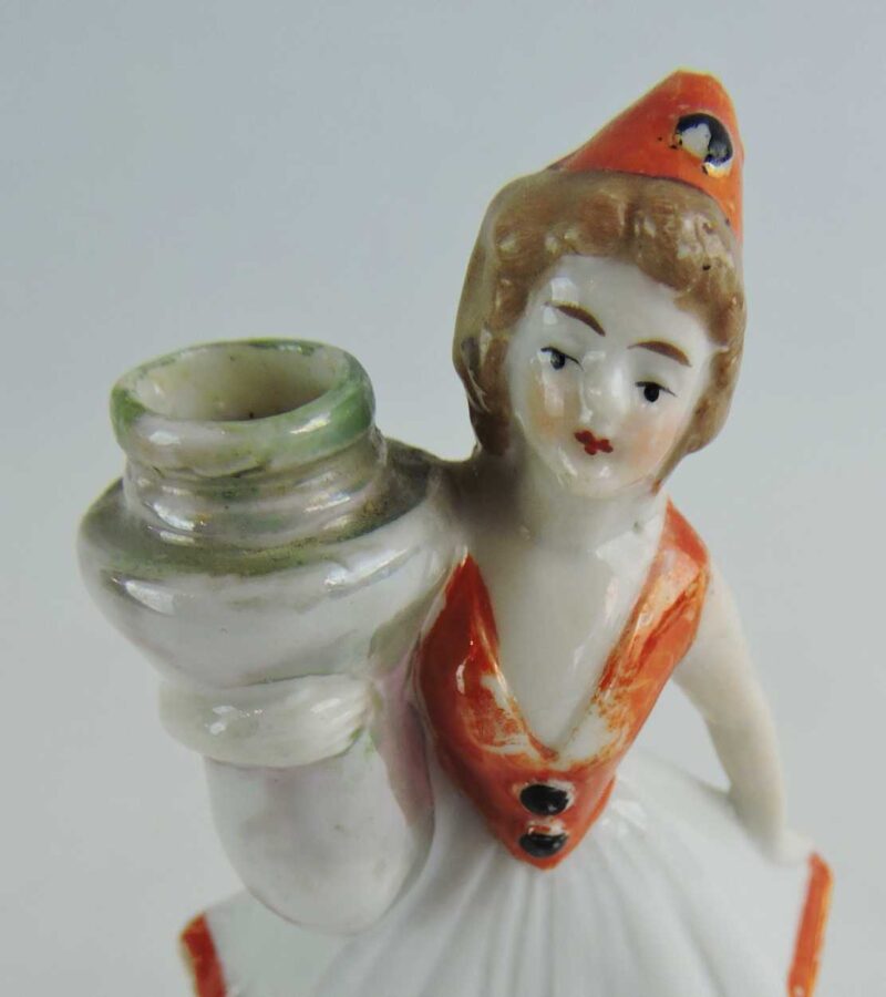 A lovely vintage porcelain perfume bottle with figure, it features circus performer dressed in orange and black, with crown stopper. The figure is all hand painted.   The top half lifts off.  This beautiful lidded jar originally used as a powder box can also be used for jewelry, vanity accessories or keepsakes.