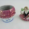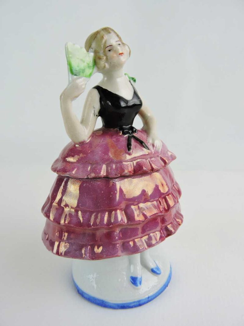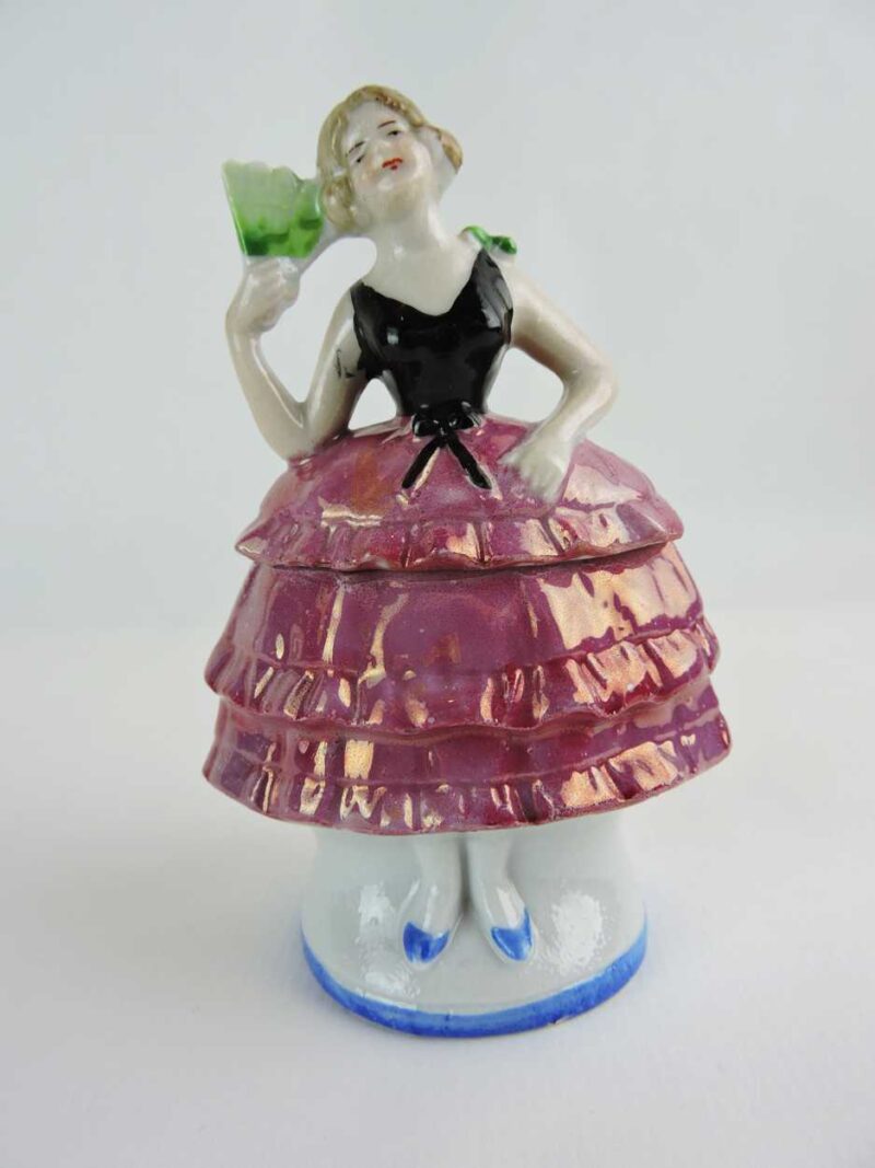 A vintage porcelain powder box that features a woman in blue shoes, a pink ruffled skirt and a black blouse, holding a green fan. The figure is all hand painted. The top half lifts off.  This beautiful lidded jar originally used as a powder box, can be be used for jewelry, vanity accessories or keepsakes.