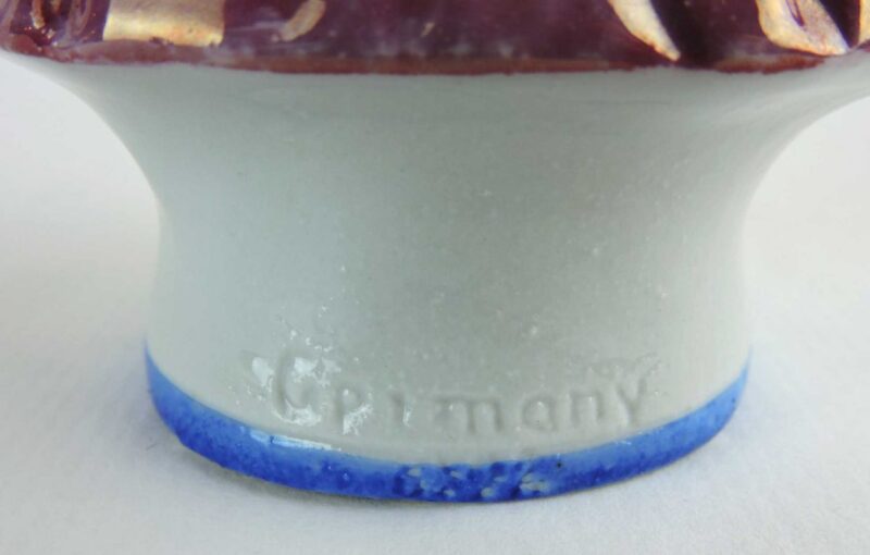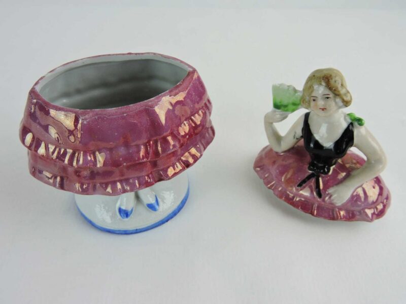 German Figural Porcelain Powder Box – Lady in Pink Ruffled Skirt and Black Blouse With Fan