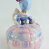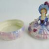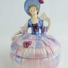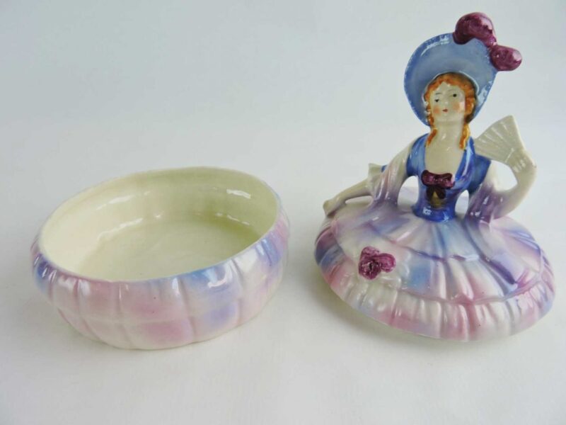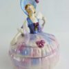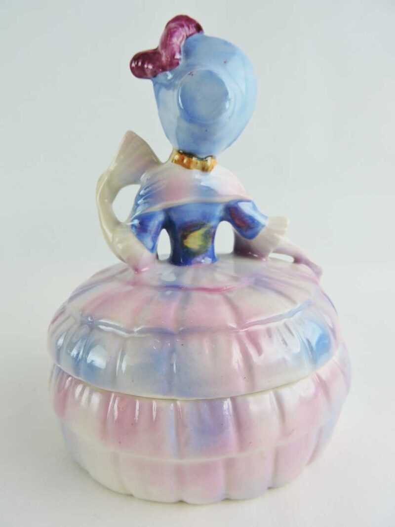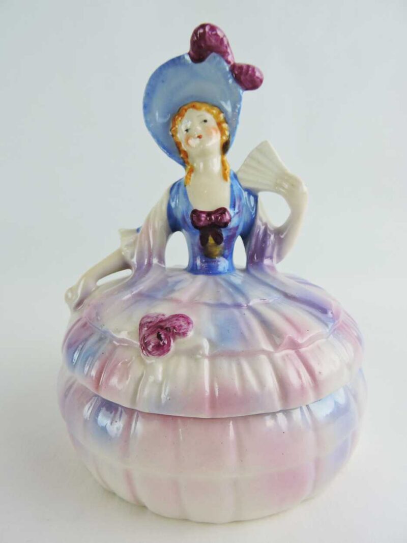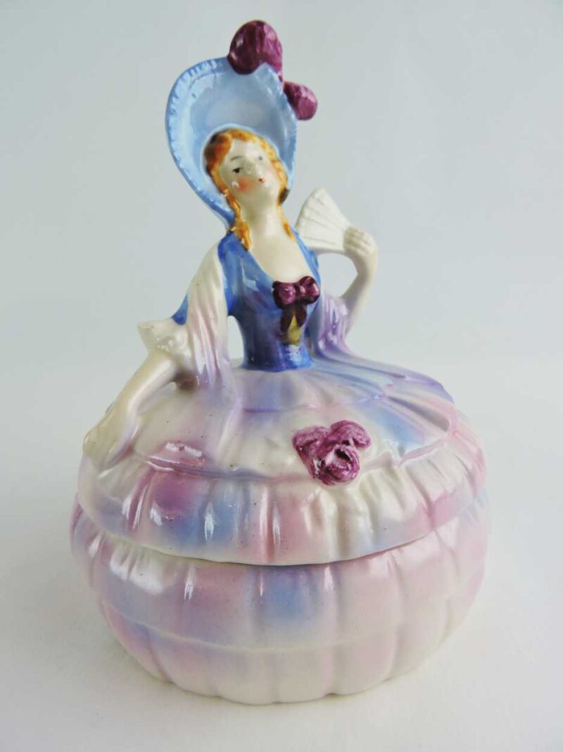 A vintage porcelain powder box that features a woman in a blue and violet Victorian dress with light shawl and large bonnet, holding a fan. The figure is all hand painted. The top half lifts off.  This beautiful lidded jar originally used as a powder box, can be be used for jewelry, vanity accessories or keepsakes.