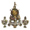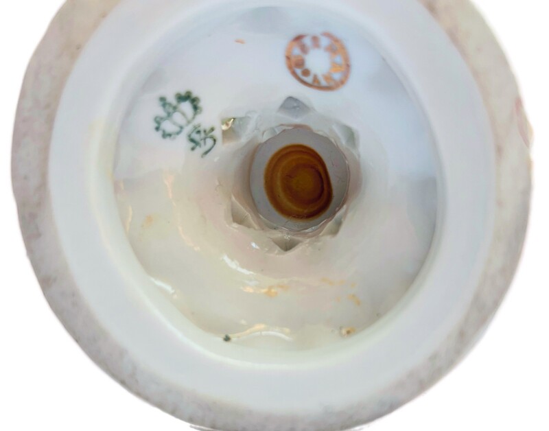 The set also has 2 Von Schierholz German porcelain marked lidded vases/urns that match the mantle clock’s theme, coloration and cherub motifs, also from the early 1900s. The dimensions of each lidded vase are: height 9.5″ x width 6.75″ x depth 4.5″.