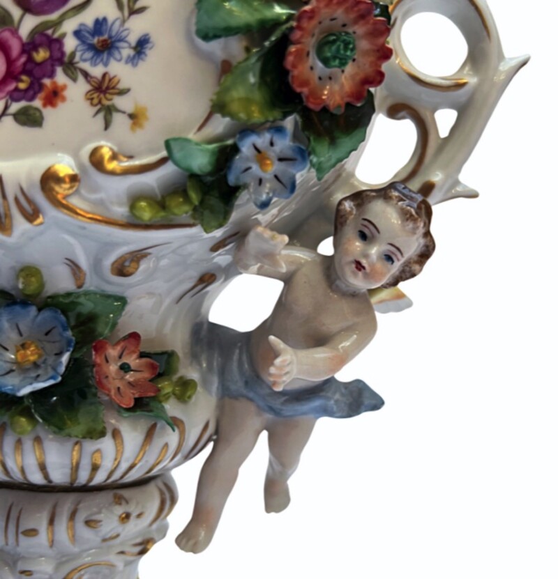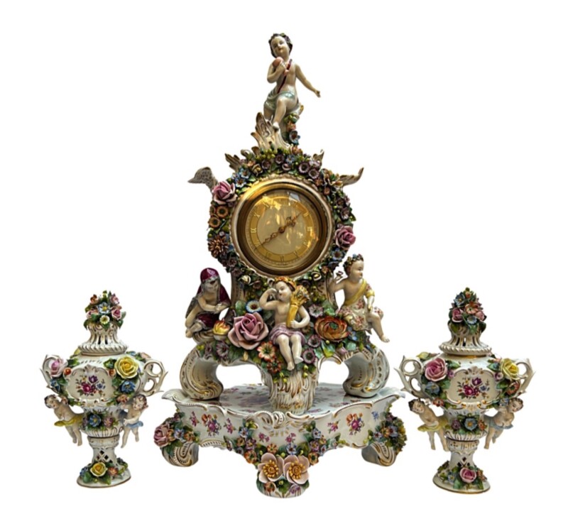 German Porcelain Cherub Mantle Clock and 2 Lidded Vases Set of 3, Early 1900s
