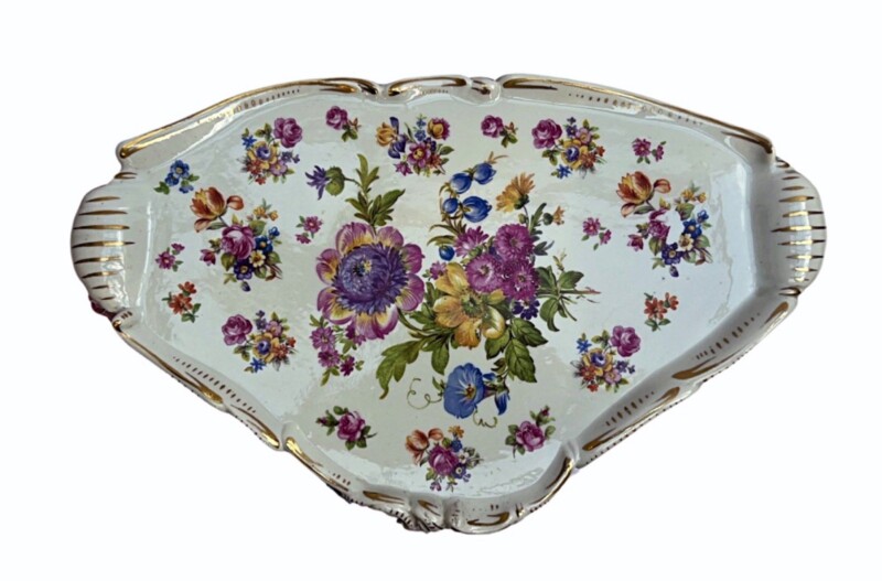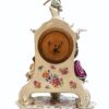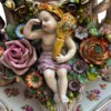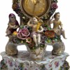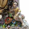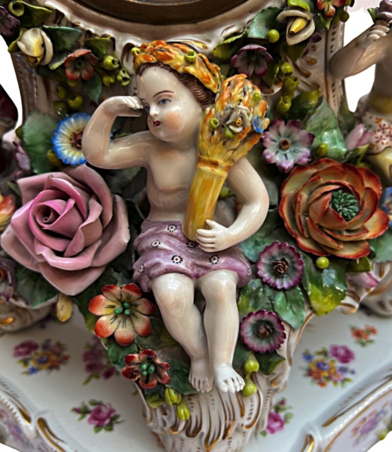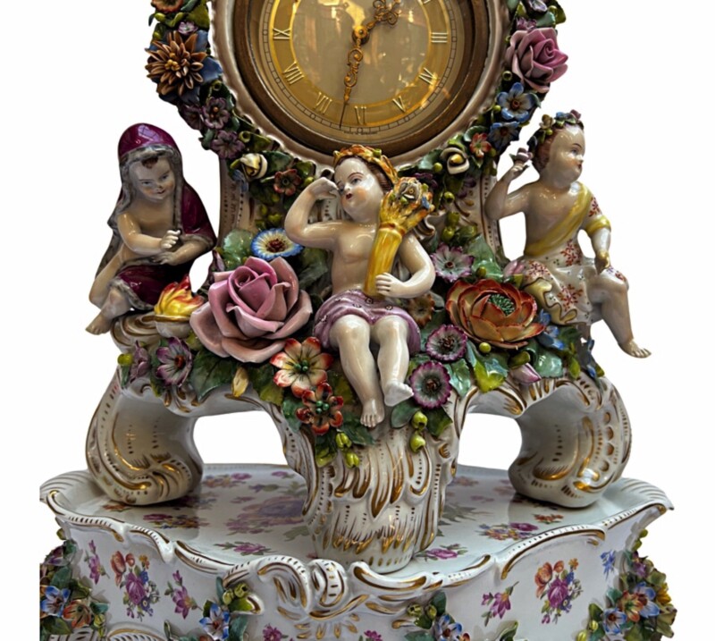 A delicate and textural example of German Sitzendorf porcelain, early 1900s, this mantel clock with its intricate flower and allegorical cherub “four seasons” motifs has beautiful gilt workmanship and lovely hand painted pastel pinks, blues and greens. The clock sits on a complementary adorned porcelain base and has a key to wind the clock movements. Dimensions for the clock and base together are height 23″ x width 6.75 x depth 9″.