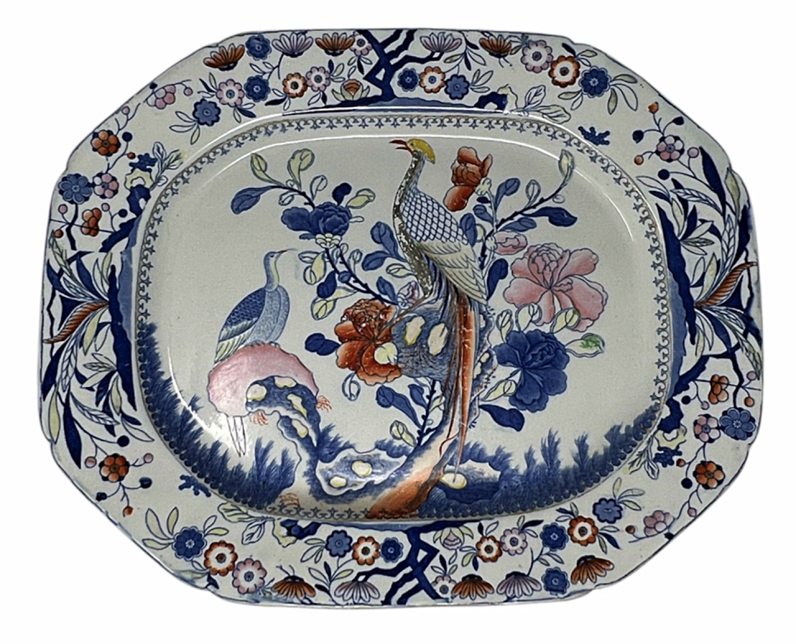 The colours remain vibrant — deep cobalt blue, iron red, soft greens and peaches — all printed and hand-enamelled over a creamy ironstone body with the weight and presence characteristic of Mason’s early period. The shaped octagonal form is framed with a broad floral border and an interior reserve alive with movement and detail.