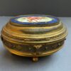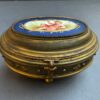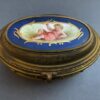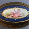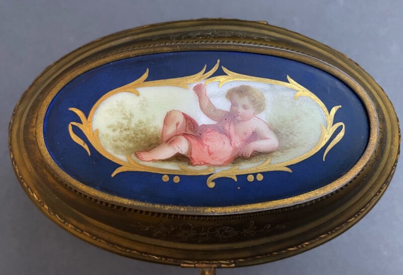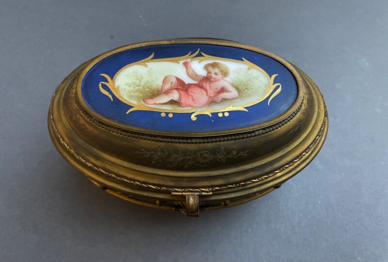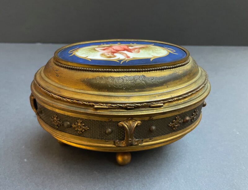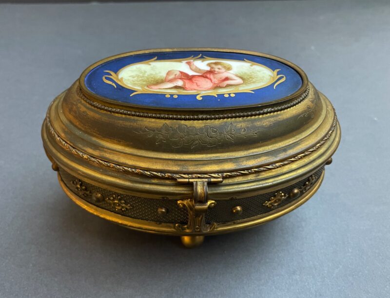 General, JewelryA lovely gilded bronze oval jewelry casket with a hinged lid and 4 ball feet. The lid of the casket in porcelain is painted, showing a reclining semi-clad putti figure.