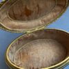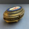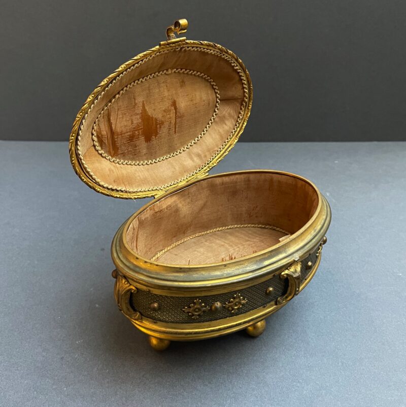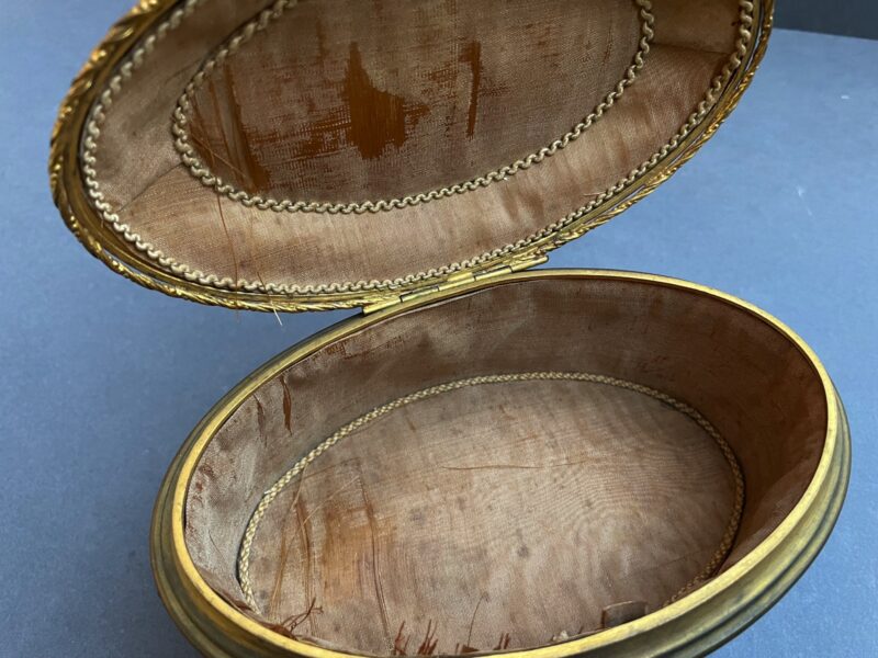 Gilded Bronze Oval Footed Jewelry Casket with Silk Lined Interior, Hinged Lid, Painted Putti on Lid