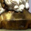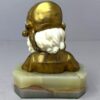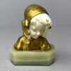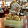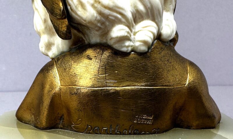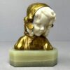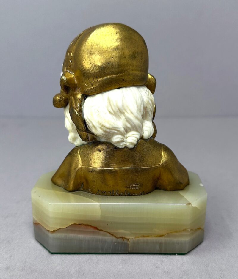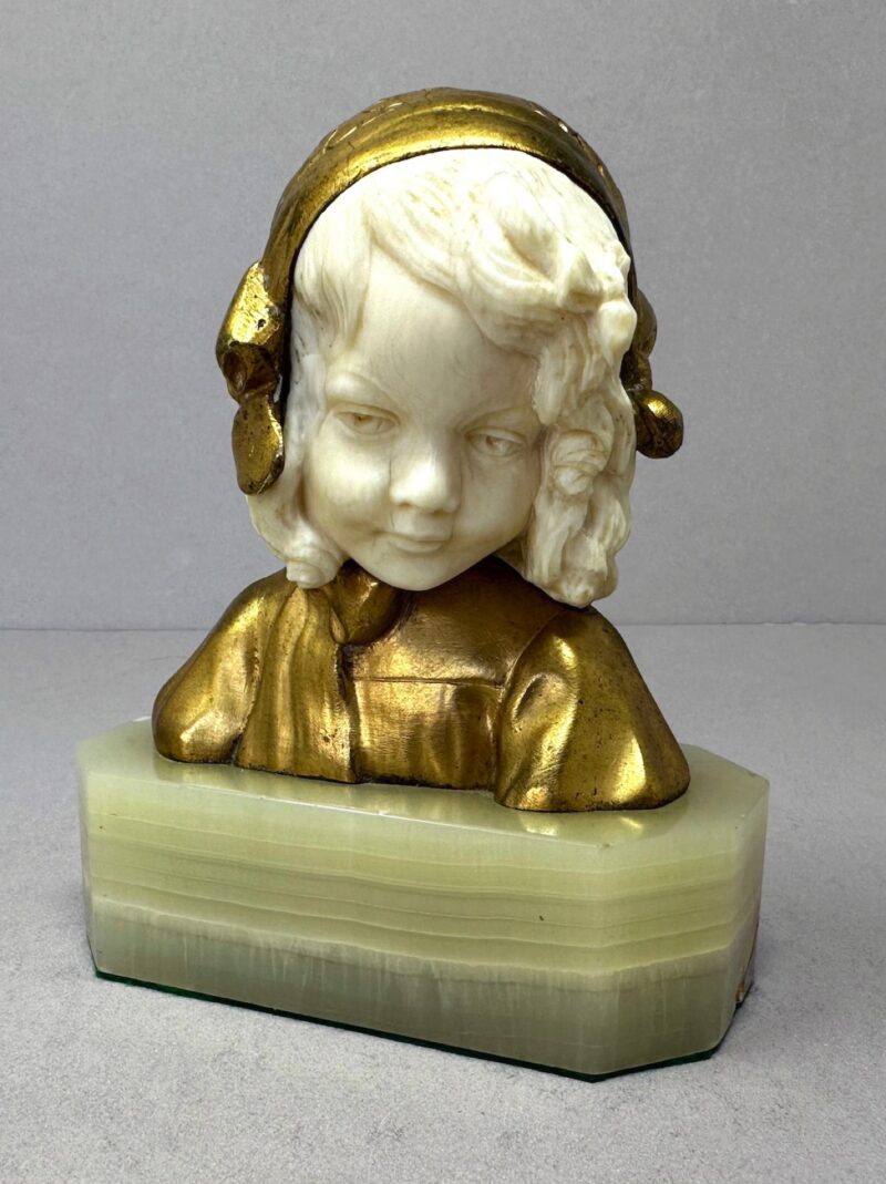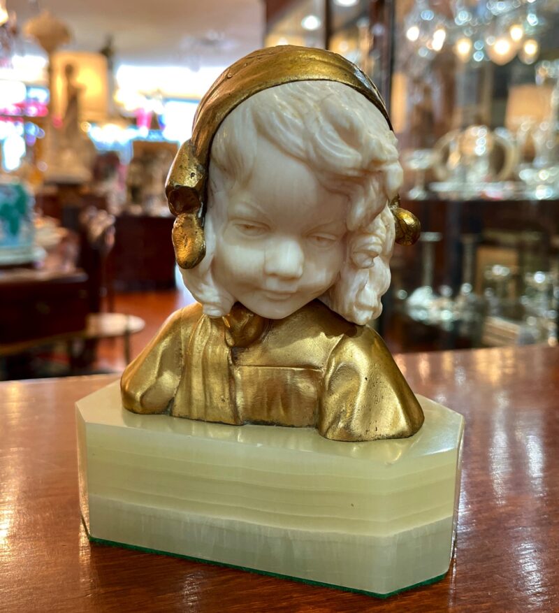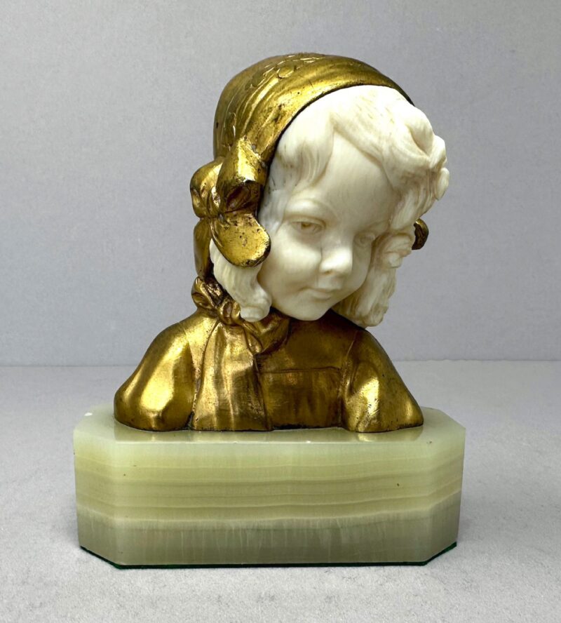 A pretty little French gilt bronze & carved bust of a child on a green onyx base.   There are two separate pieces or carved ivory – one for the face and one for the back hair. The bust is signed on the back by Louis Barthelemy also stamped “Made in France”  and dates early 20th century.