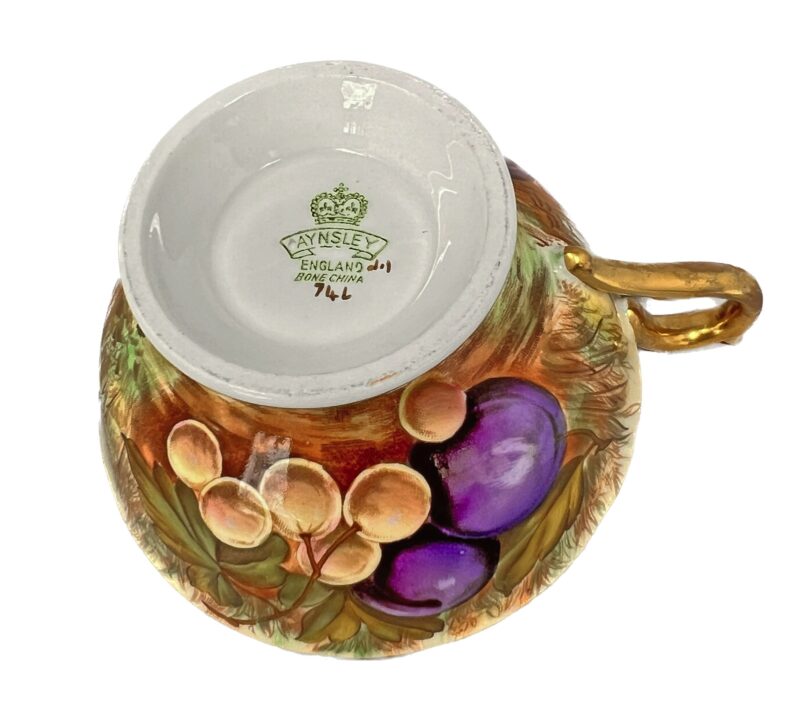 GOLD AYNSLEY CUP & SAUCER . Orchard Fruit series signed by D. Jones (cup) and N. Brunt ( saucer). Hand Painted circa early 1930s. Beautiful shimmering gold interior of cup. rare and in pristine condition.