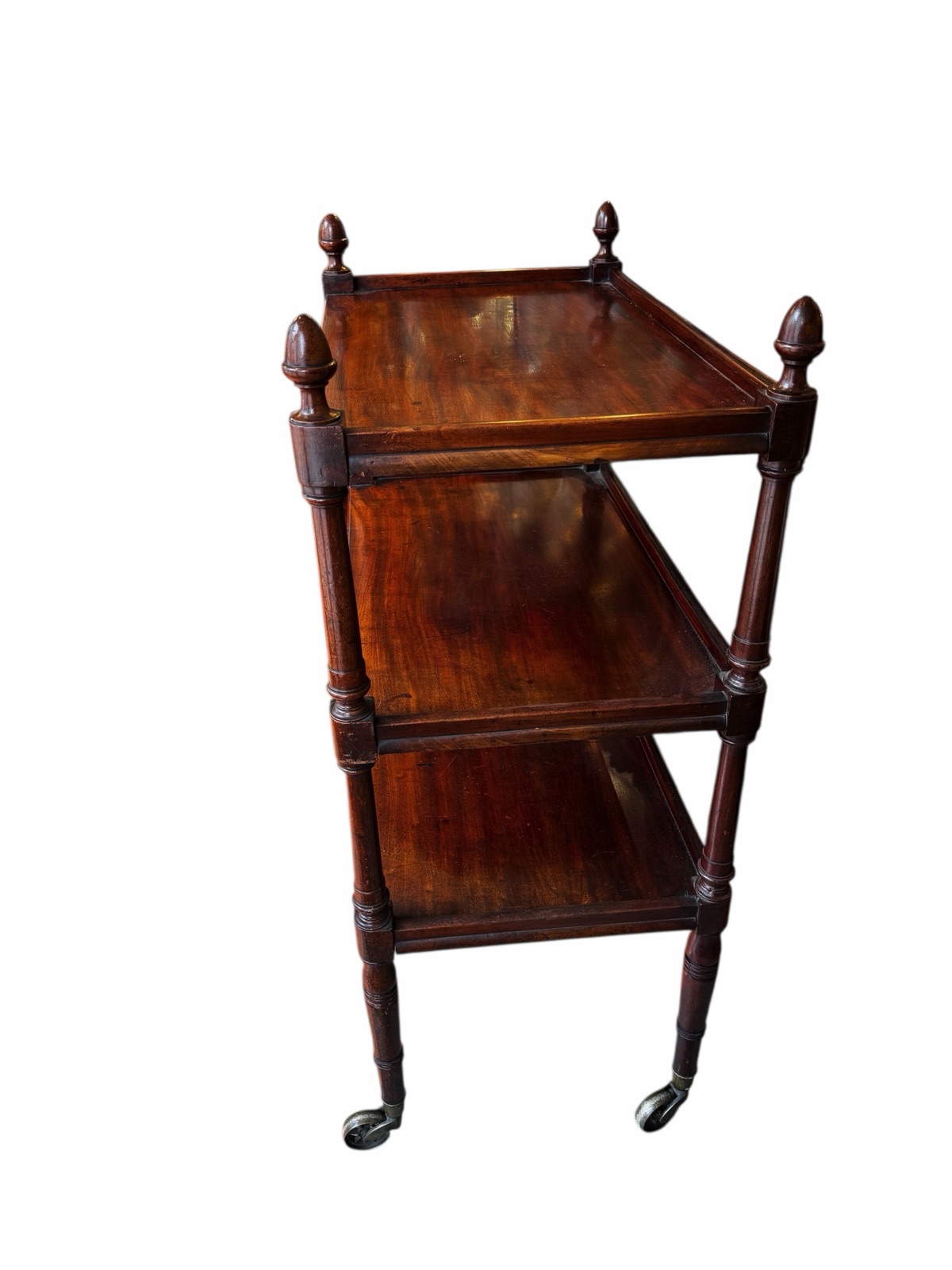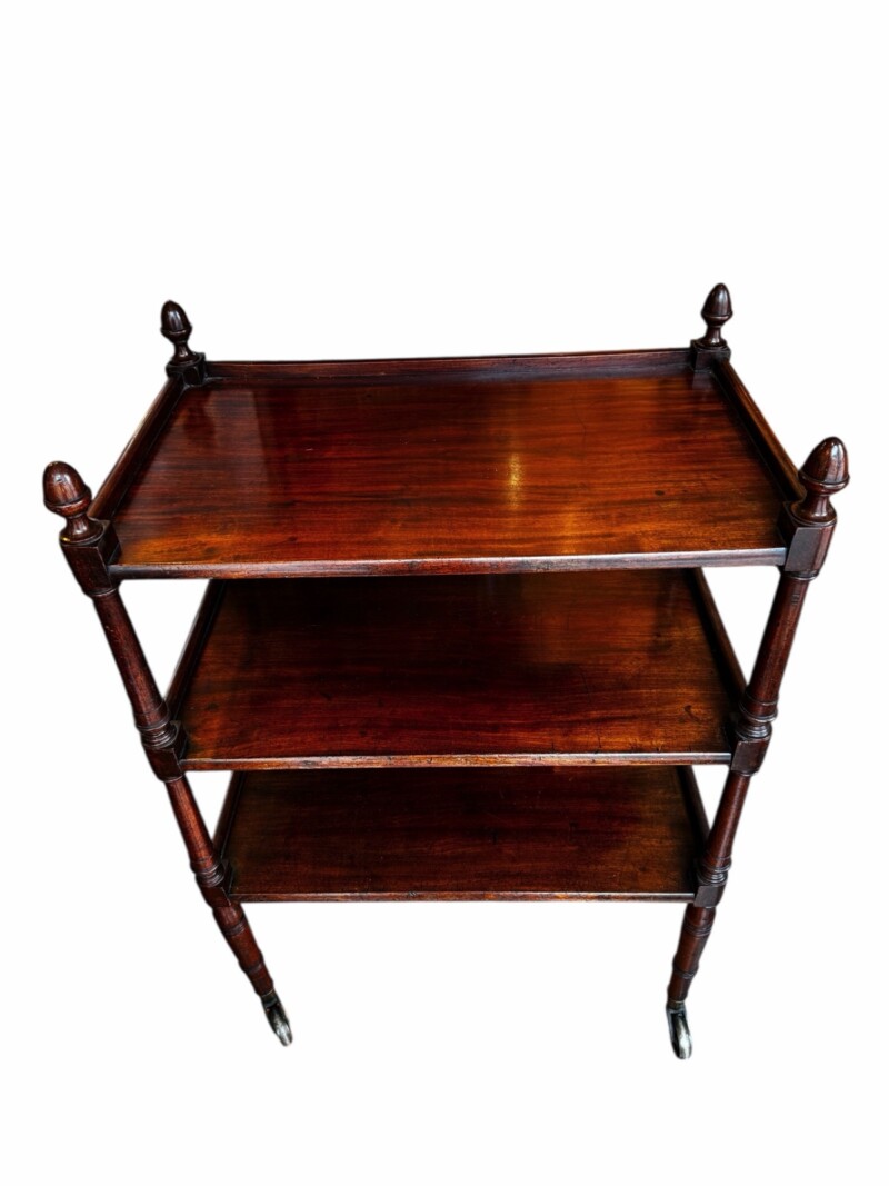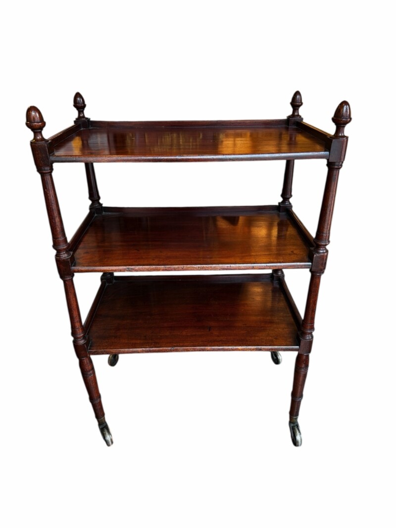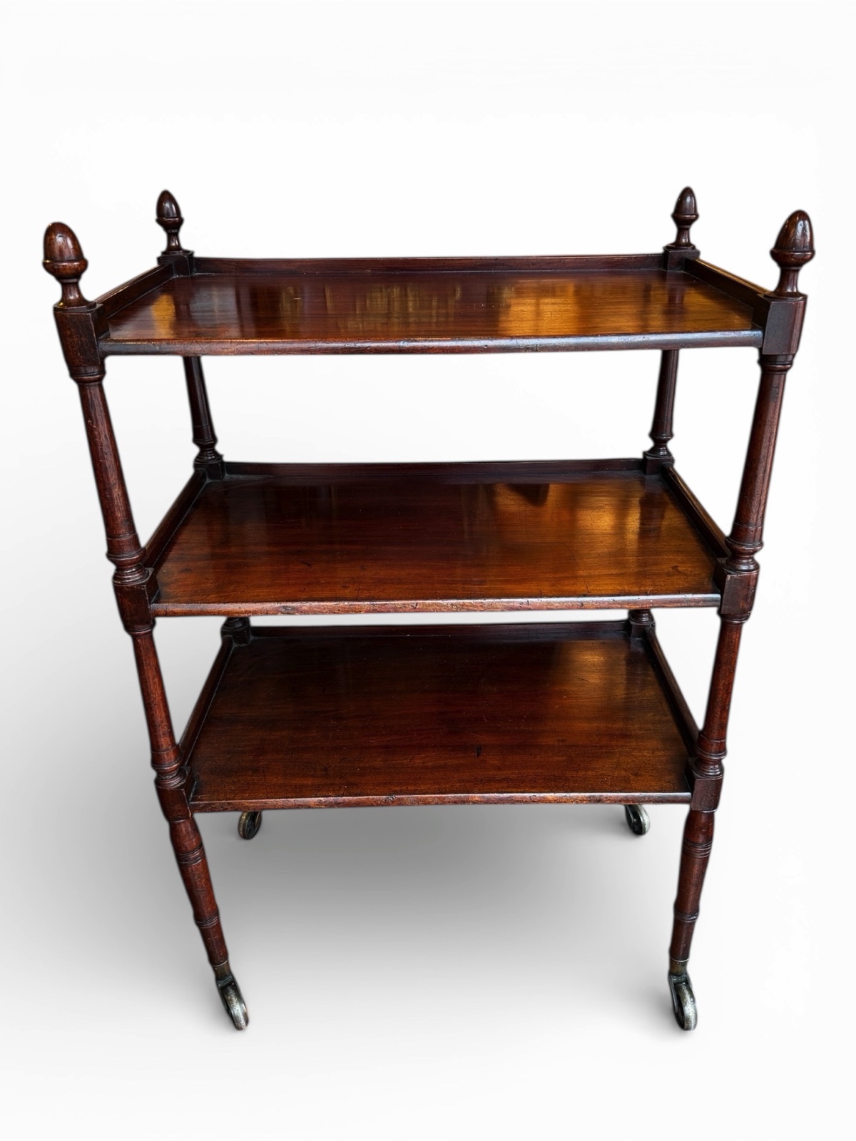 FurnitureGorgeous English Georgian Era mahogany three tier server on large original metal casters. Three trays in solid mahogany with beautifully turned legs and columns. The uprights end with turned finials adding a touch of luxury. Circa early 1800s.