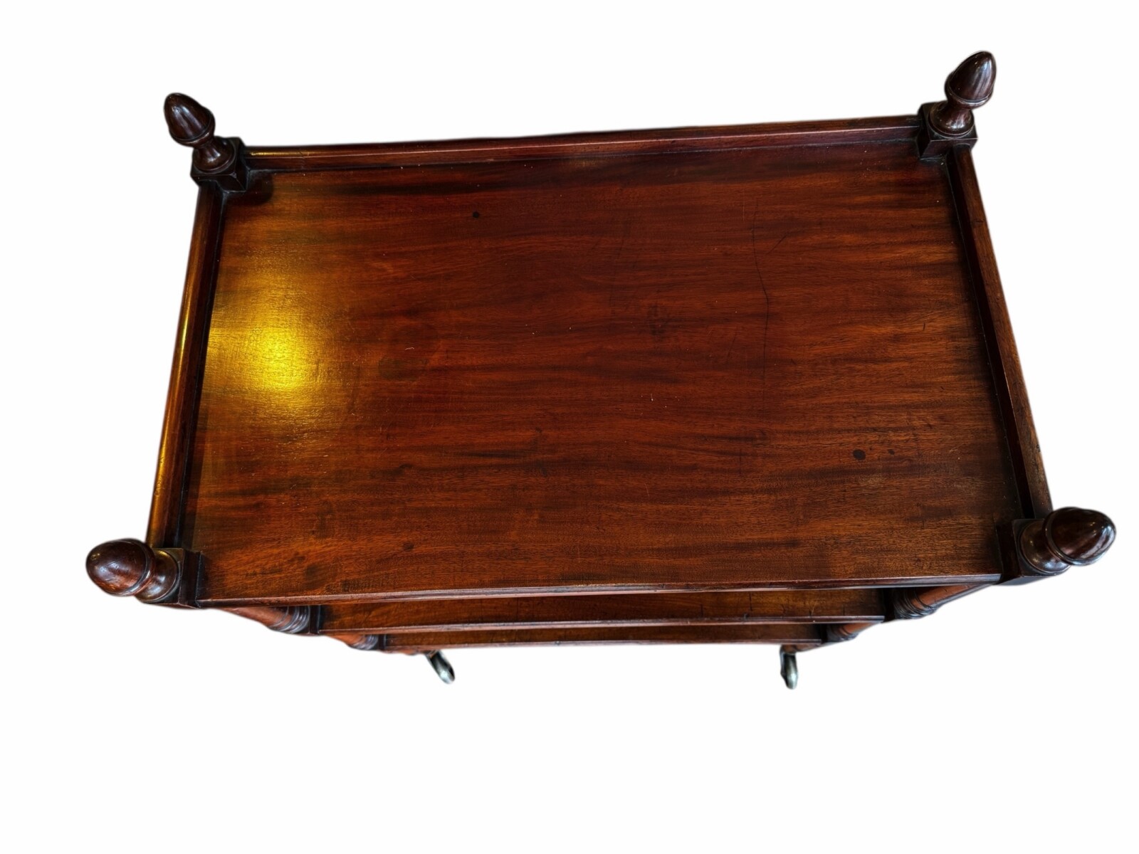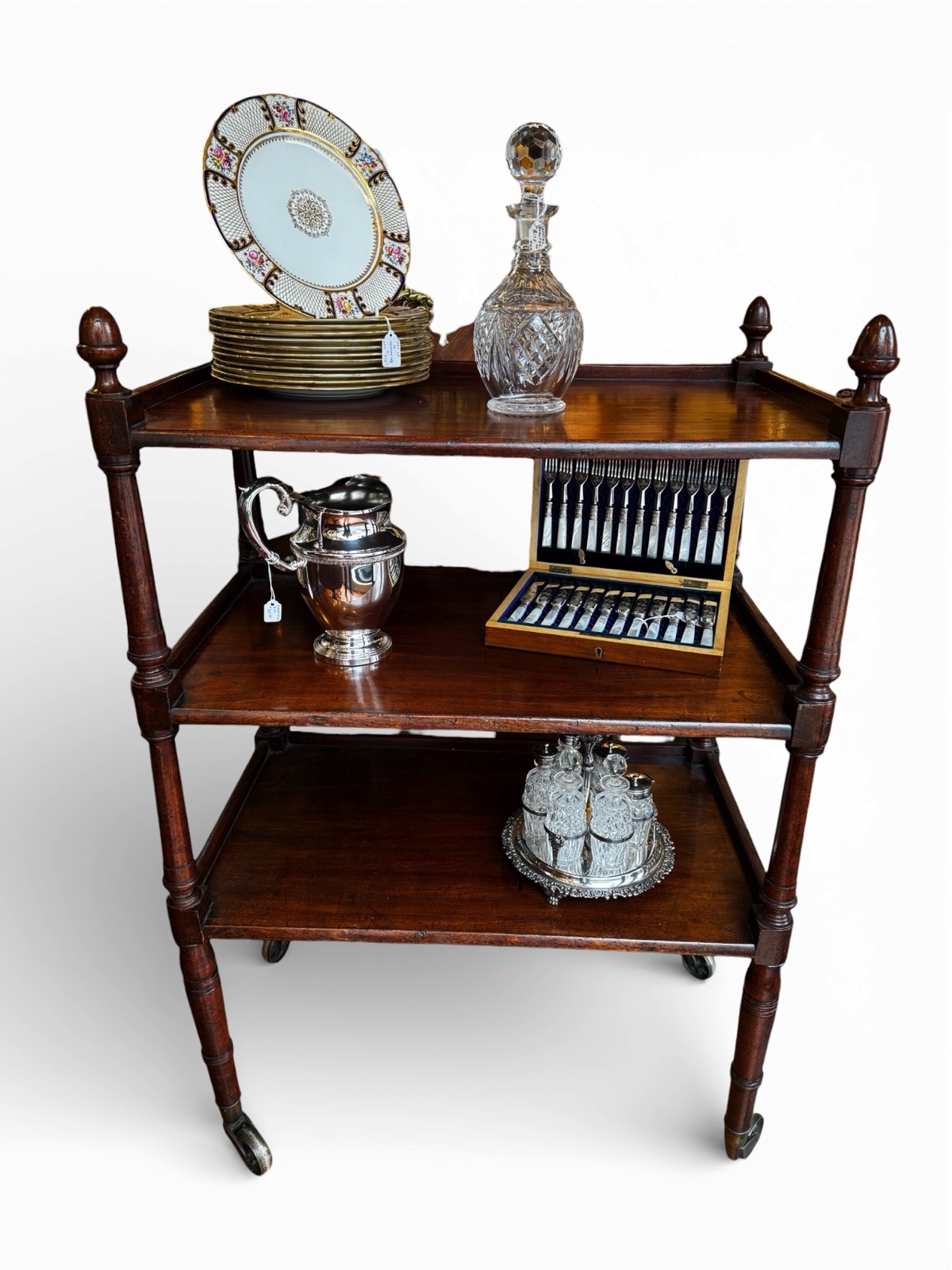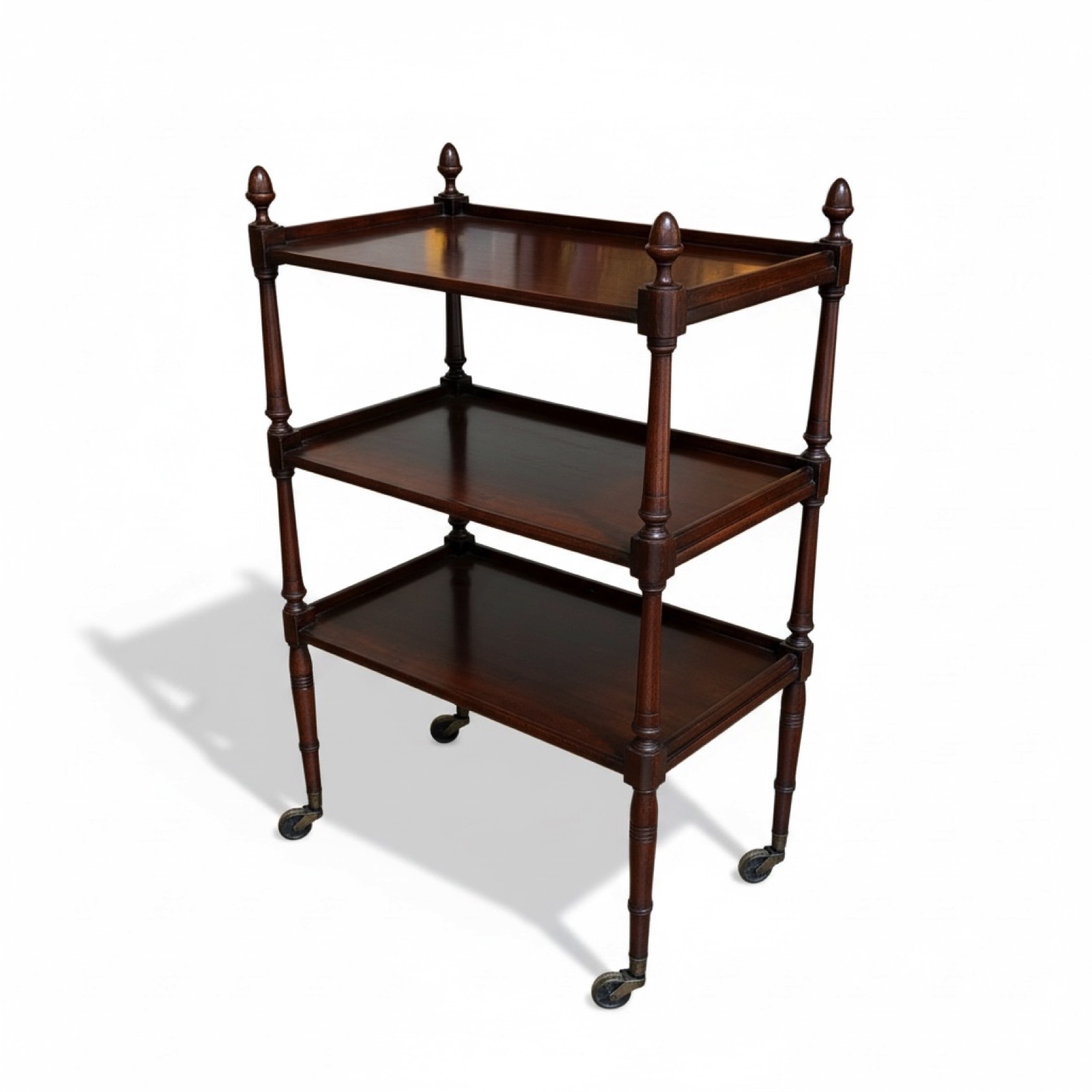 FurnitureGorgeous English Georgian Era mahogany three tier server on large original metal casters. Three trays in solid mahogany with beautifully turned legs and columns. The uprights end with turned finials adding a touch of luxury. Circa early 1800s.