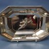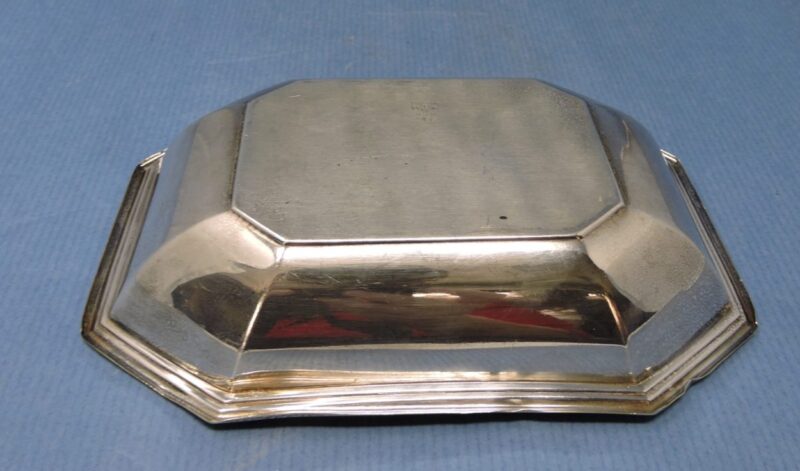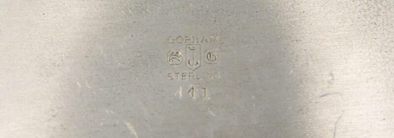 A lovely sterling silver rectangular dish, 114 grams, made by Gorham. It has a cherub decoration in the centre of the dish. On the underside is stamped “Gorham Sterling 441” with the maker’s marks.
