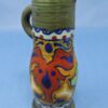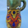 A wonderful, Gouda colourful Dutch art pottery jug. The jug has a green background with blue trim and colourful abstract patterns around the body of the jug.