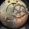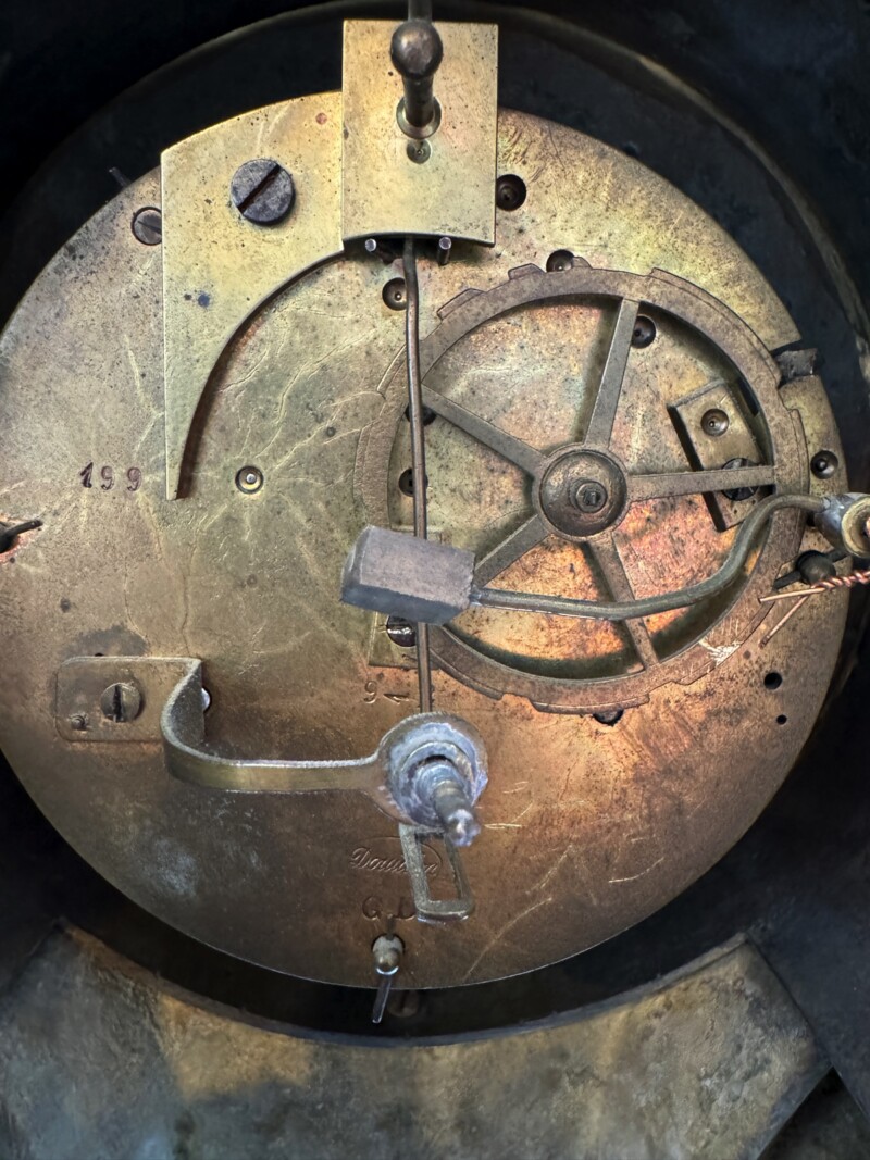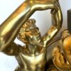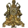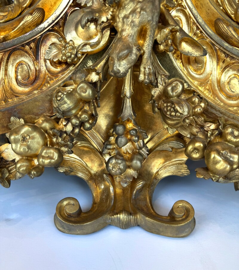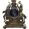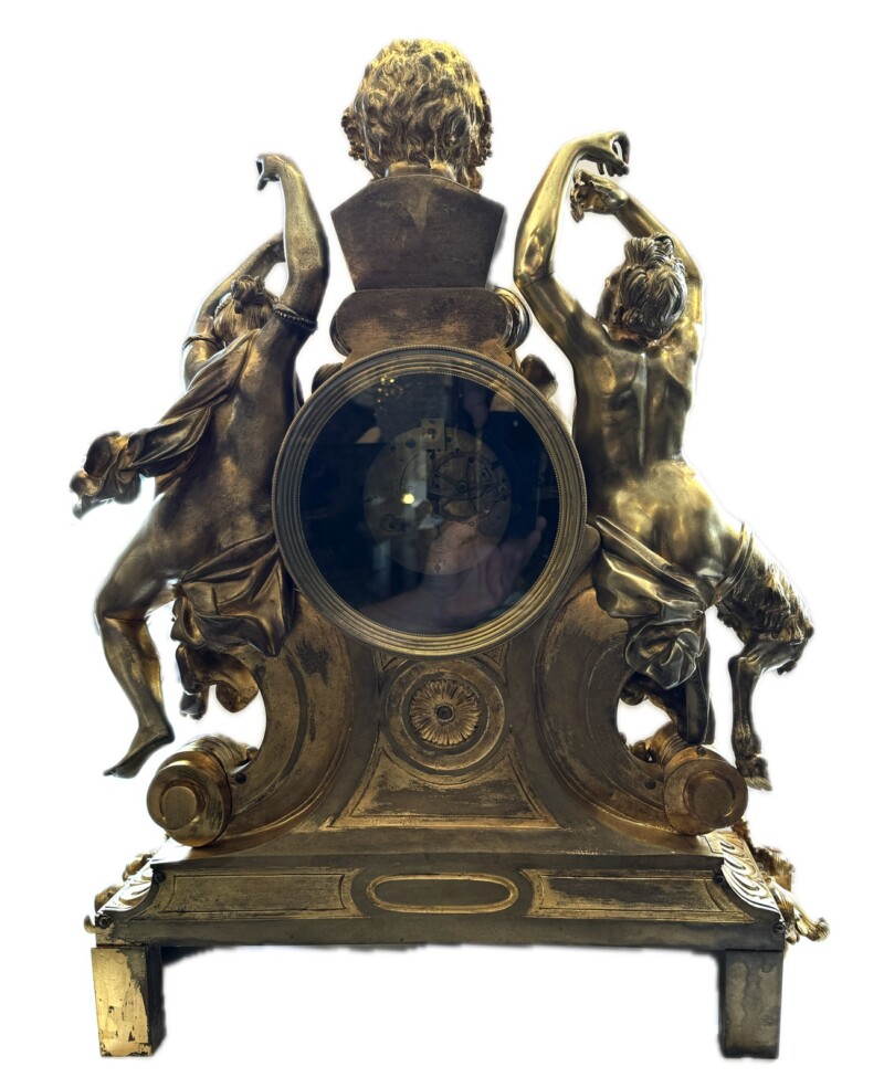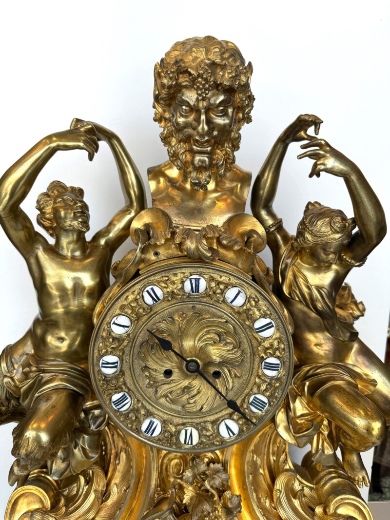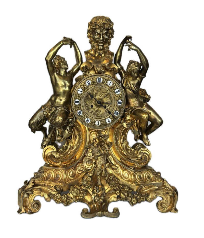 v** SOLD ARCHIVES **vA grand, exquisite clock and a wonderful example of the French Rococo period. A “salon” treasure, this 28 inch gilt bronze figural clock features 3 dynamic figures – The mythological figure of the God Pan centred between a Satyr (half man/ half beast) on the left and a “nymph” woman figure on the right. Pan allegorically personifies “lust” and owes his reputation to the seduction of nymphs. The figures form a triangular design that surround the clock face with Pan at the apex or the “central” character to the allegory. The figural grouping is supported by a Rococo base that has a central ewer with overflowing wine, grapes and grape leaves that flow down with fruit and split to the left and right near the bottom. A dead animal also hangs just below the ewer. The clock face has enamelled Roman Numeral numbers. The movement has a chime that strikes on the hour and the half hour and the pendulum is held by a silk suspension. The movement is marked initials CM.