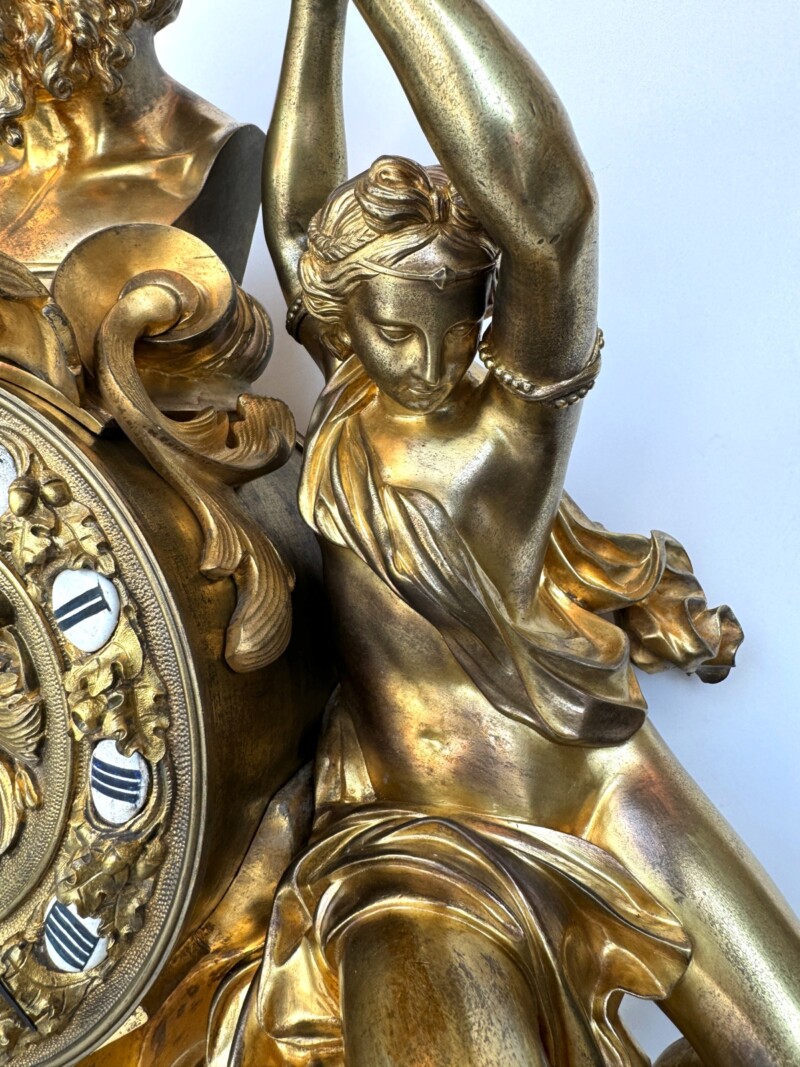 Grand Rococo French Clock with Gilt Bronze Figural Grouping – the God Pan, Satyr & Nymph. Silk Suspension Movement – Circa 1840