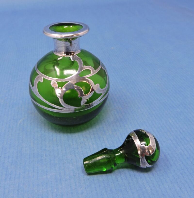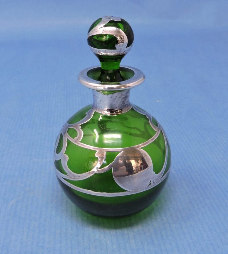 Green Glass Silver Overlay Perfume Bottle – c.1900